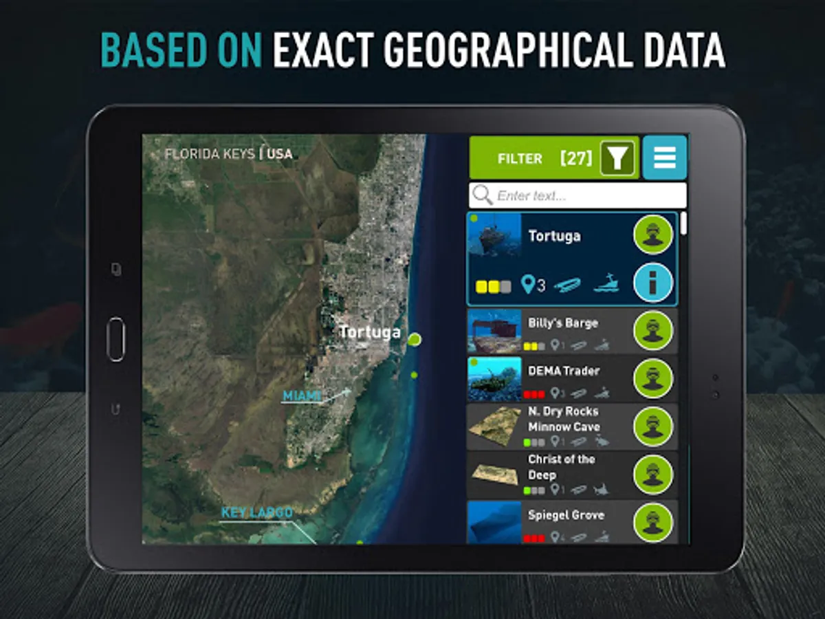 Inspect the reef in different views (3D/2D, terrain, depth and underwater views). Gather information on the dive site and view photos from other divers. Our maps are complemented by exclusive briefing information, including dive site description, tours and hot spots; provided by our trusted regional partner dive instructors. Dive the reef to try different tours and visit the best hotspots. Explore underwater worlds like never before!