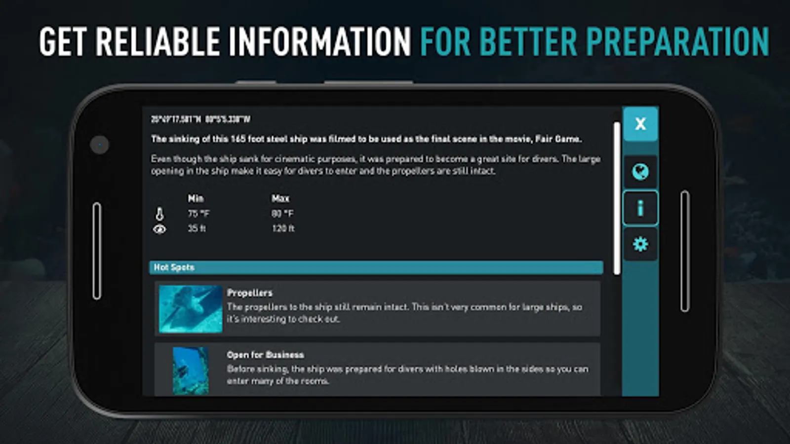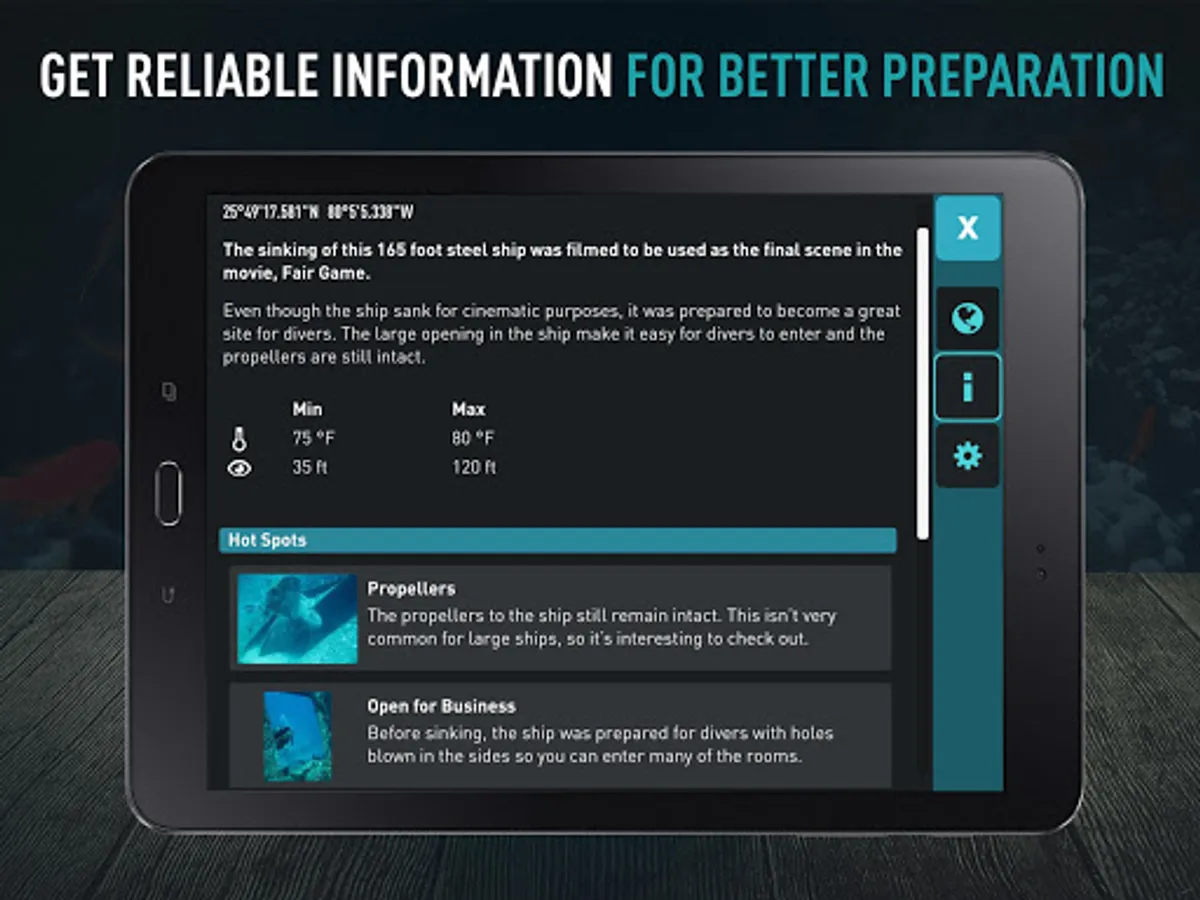 Pre-discover dive sites in natural view to prepare for your diving adventures. Ocean Maps helps both beginners and professionals avoid common diving issues like disorientation and inadequate planning. Hand-drawn maps are known to have low accuracy, but our maps based on high resolution sonar, video and satellite data ensure the most accurate site visualization. Make use of the interactive first-person 3D dive mode to explore underwater worlds while you remain on firm ground.