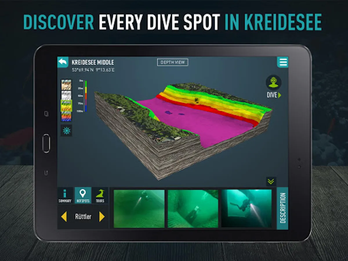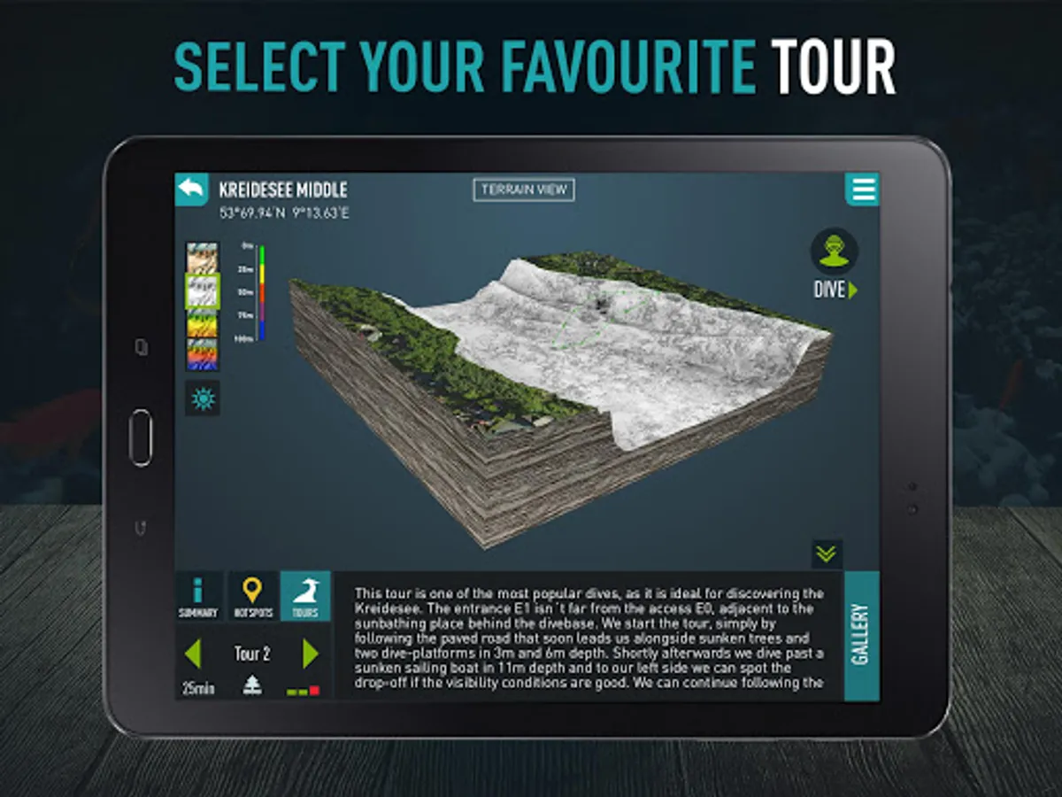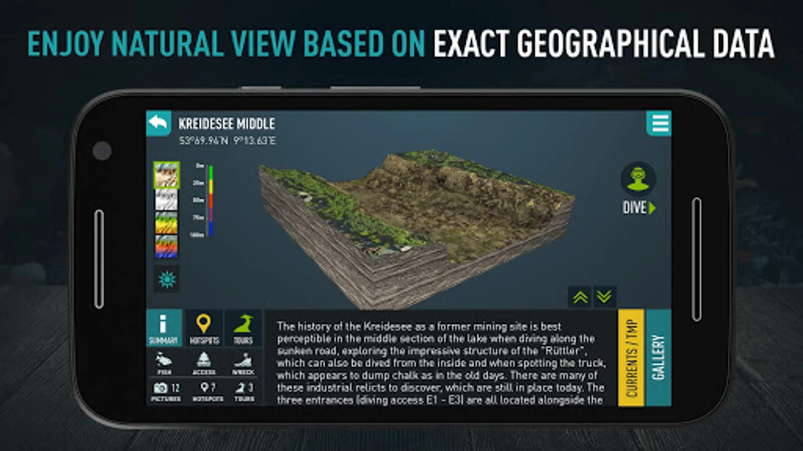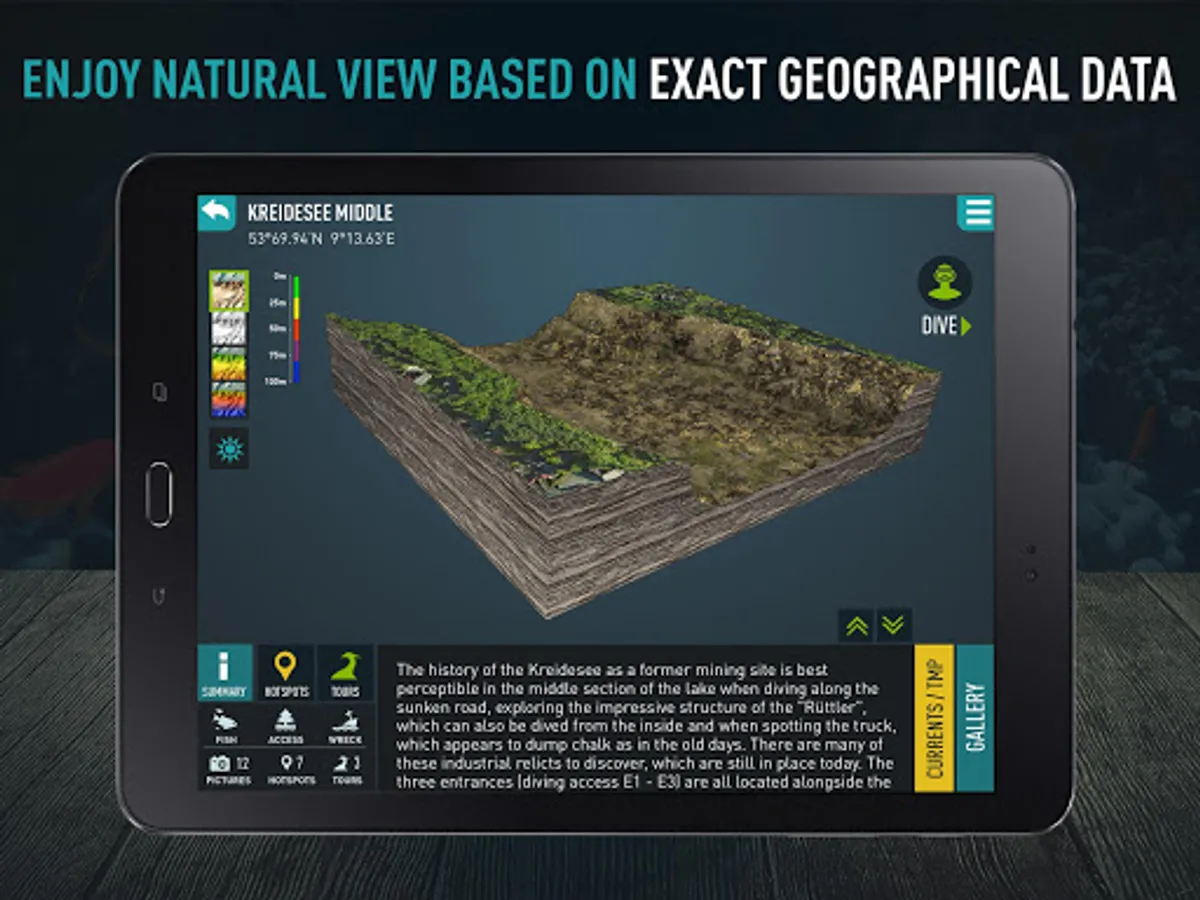Inspect the reef in four different views (terrain, natural, depth and your custom depth view). Gather information on the dive site and watch photos made by other divers. Dive the reef in different seasons, try different tours and visit the best hotspots. Explore underwater worlds like never before!