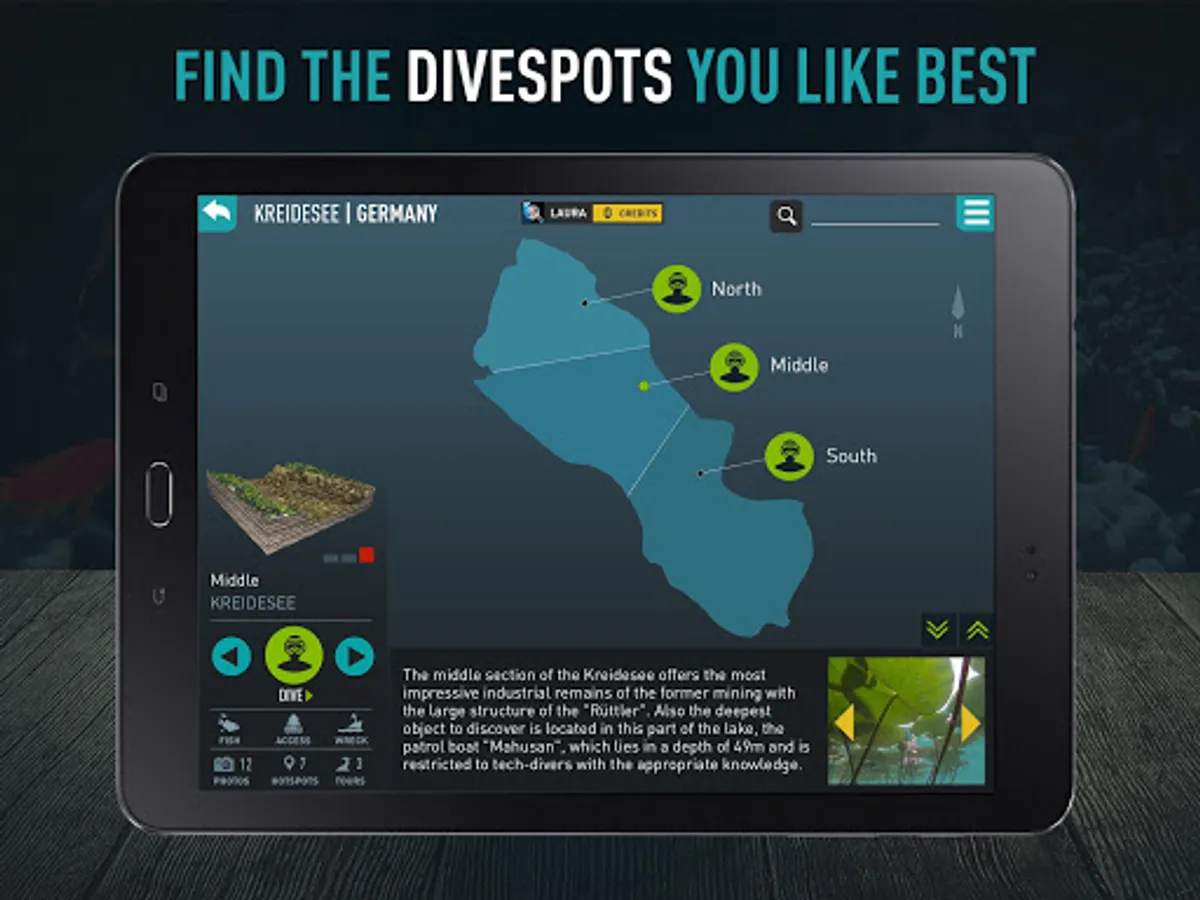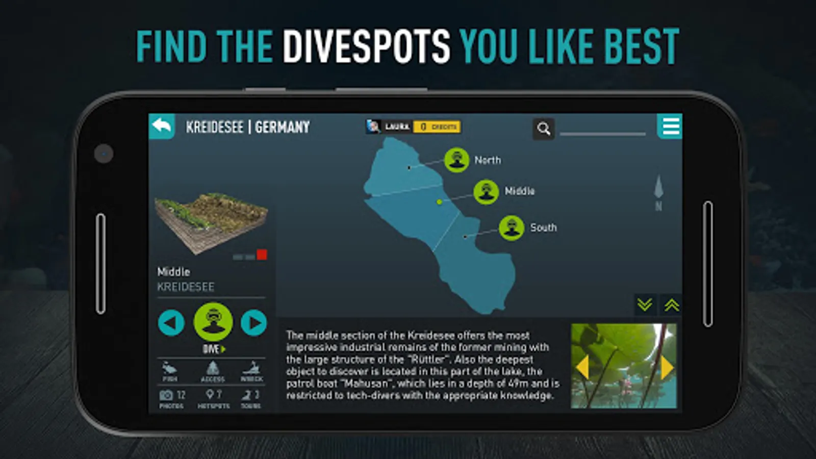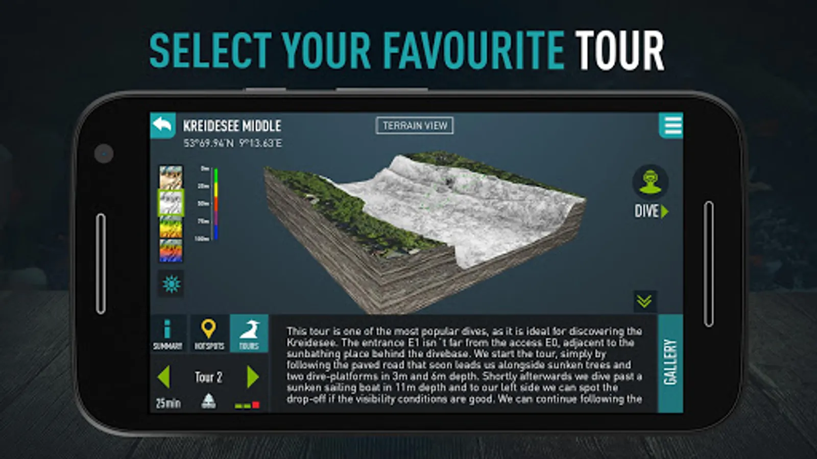 Inspect the reef in four different views (terrain, natural, depth and your custom depth view). Gather information on the dive site and watch photos made by other divers. Dive the reef in different seasons, try different tours and visit the best hotspots. Explore underwater worlds like never before!