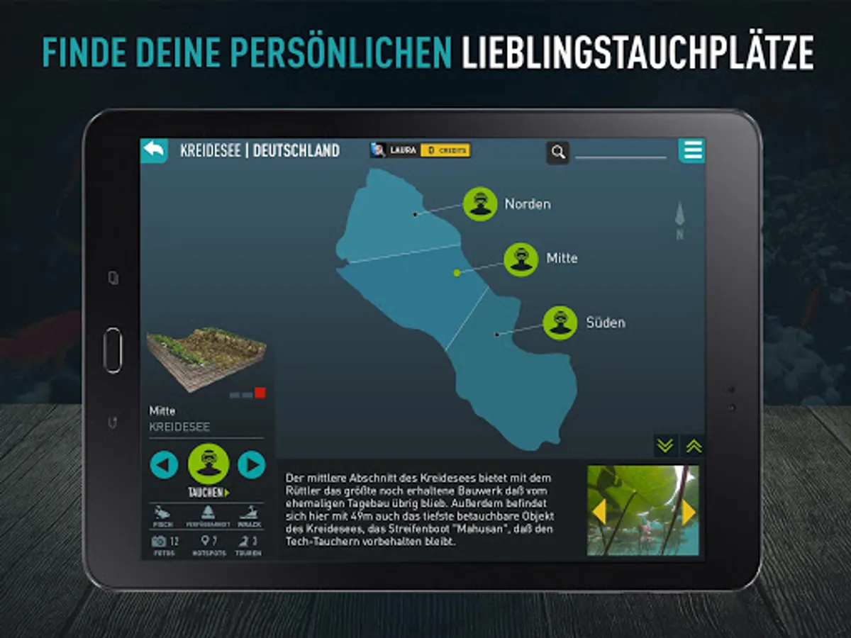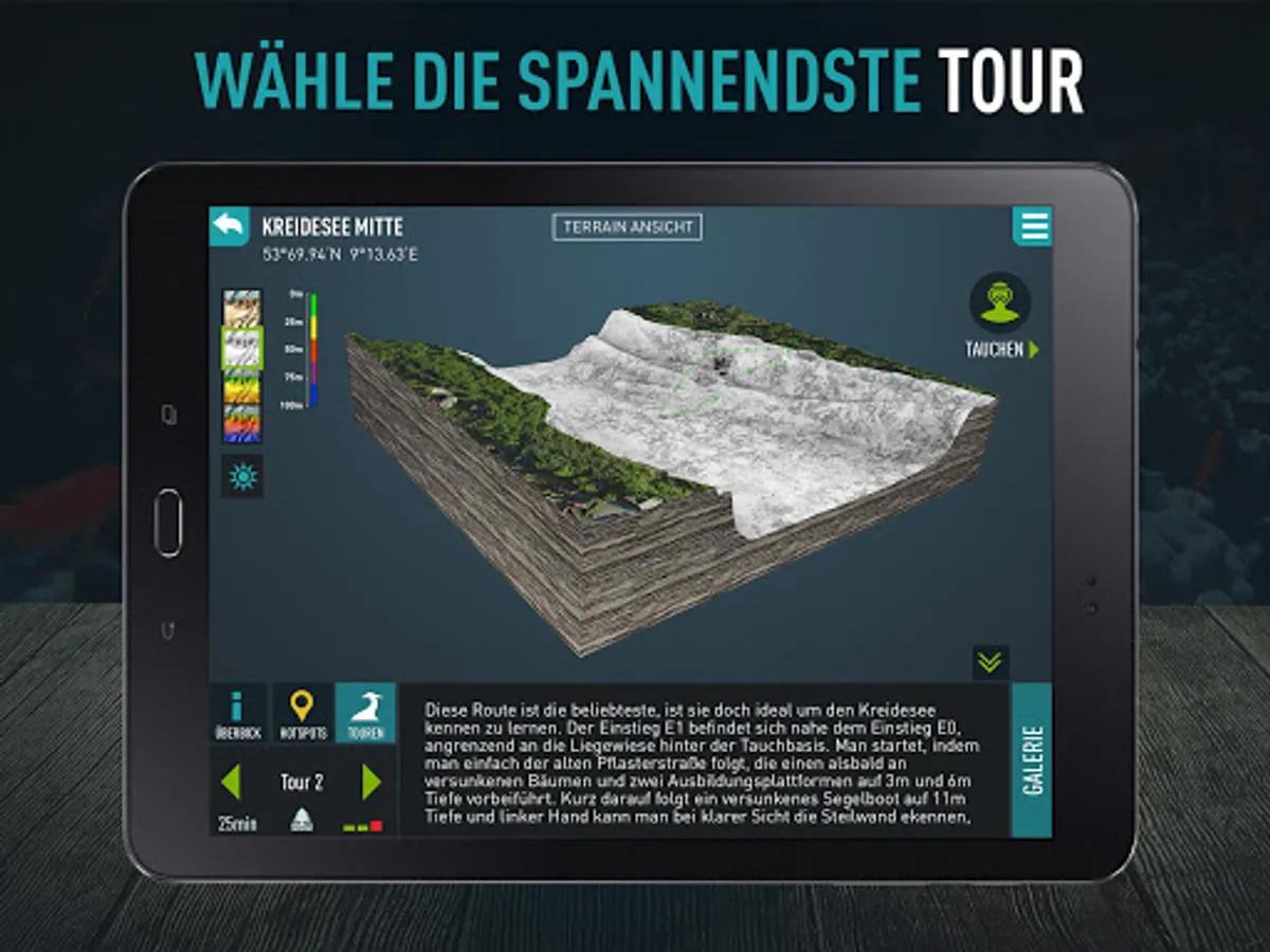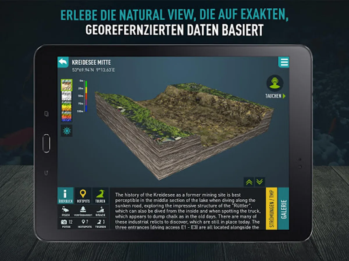 Discover the best dive sites in 3D at one of the most visited dive site in Germany: Kreidesee in Hemmoor. We are happy to introduce this unique diving location with 3 scuba dive sites, 8 tours and 20 hotspots, ready for exploration! Prepare for your underwater adventure with our interactive dive simulations in a 3D environment based on exact geographical data.