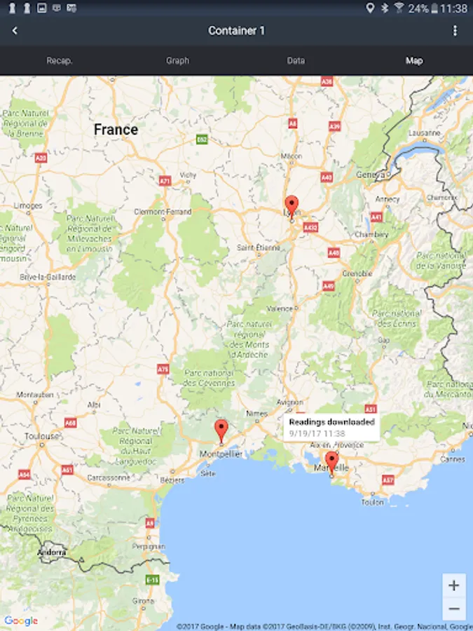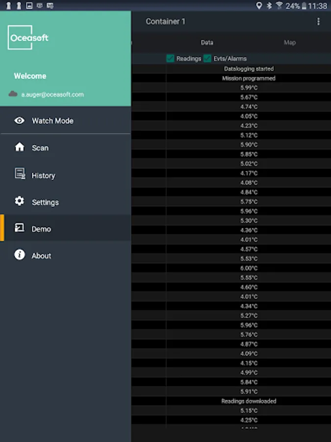 People in your cold-chain process can then use OCEAView to view readings, graphs, alert status, and more. The app enables you to configure missions, store information in files, and send reports. You may also share data with other people via the Cloud.