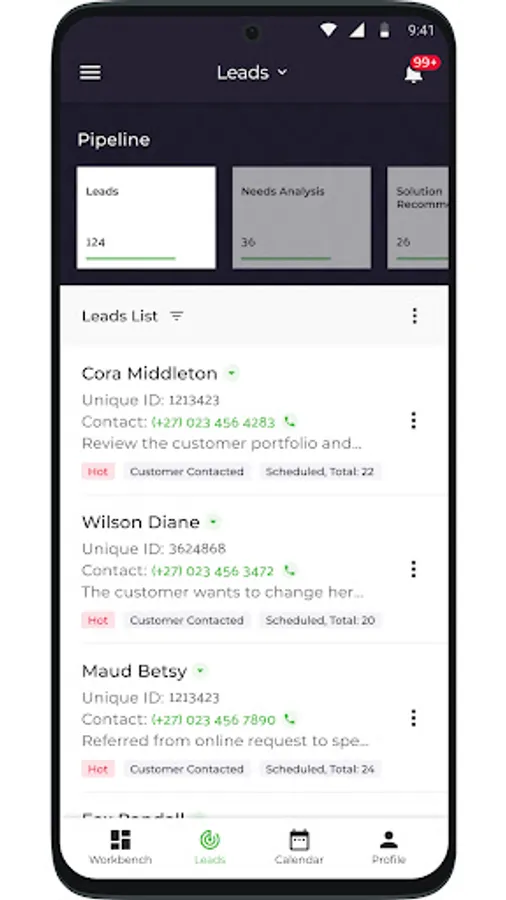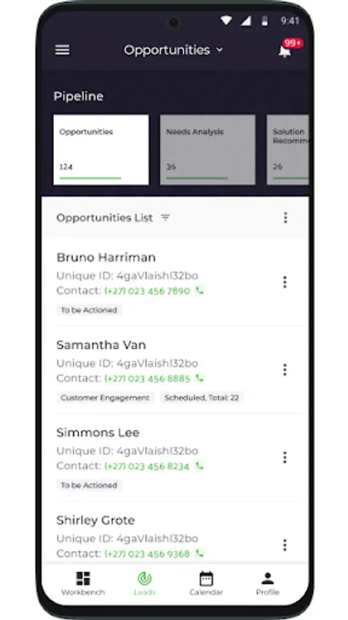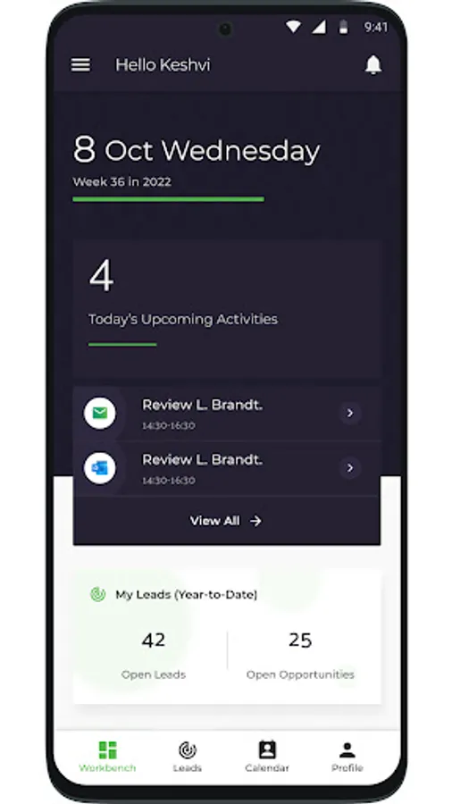You can also view and manage your diary, access leads and opportunities, and track your interactions.