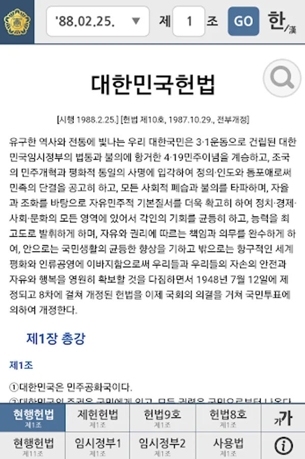 1919년 4월 11일에 제정된 대한민국 임시헌장 부터 현행 헌법까지의 모든 헌법을 수록하였습니다.