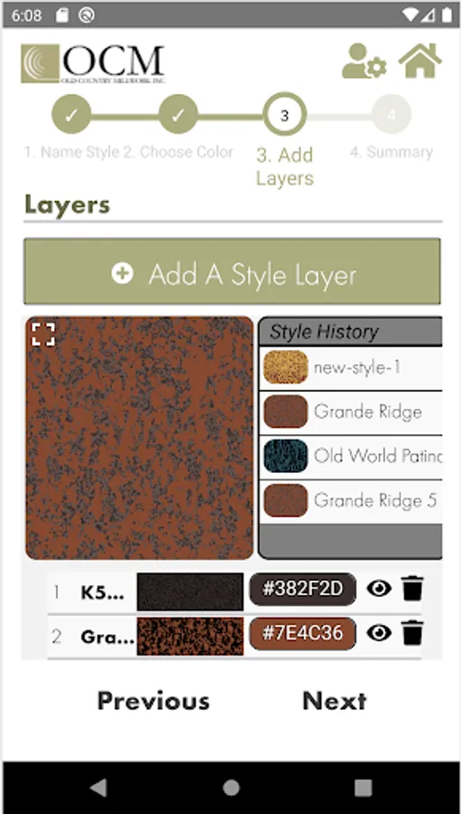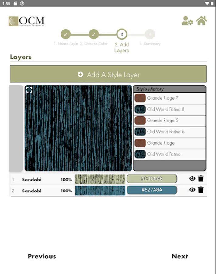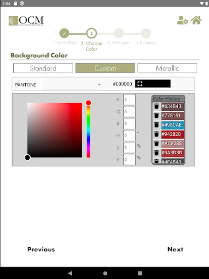 Custom colors are also supported: RGB, HSV, PANTONE. Custom styles are submitted directly to OCM where expert technicians can fabricate materials exactly matching your custom style.