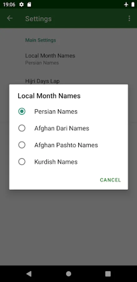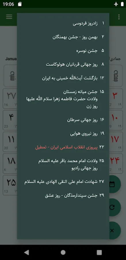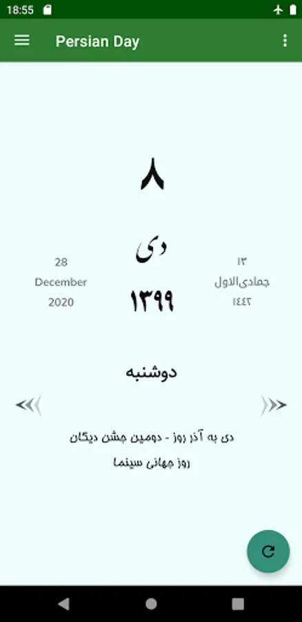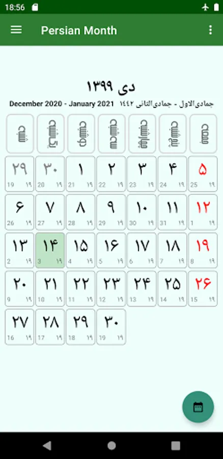 Persian Calendar represents the current date in Iranian or Afghan Dari or Pashtu or Kurdish. Also equivalent in Lunar Hijri and Gregorian (Miladi) calendar systems is shown. This first panel shows Day along with the events of the day.