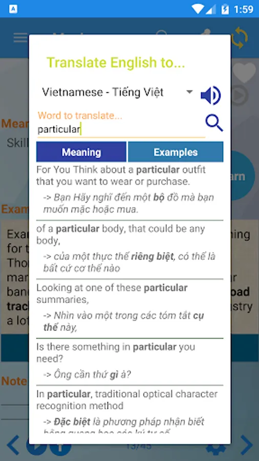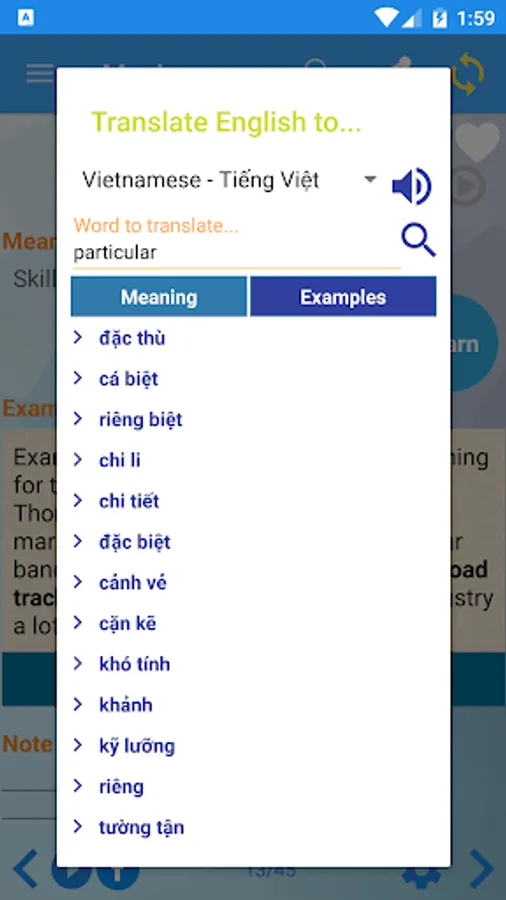 + Mean and example for each words