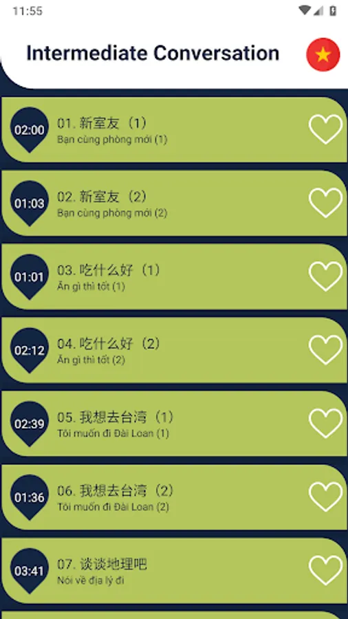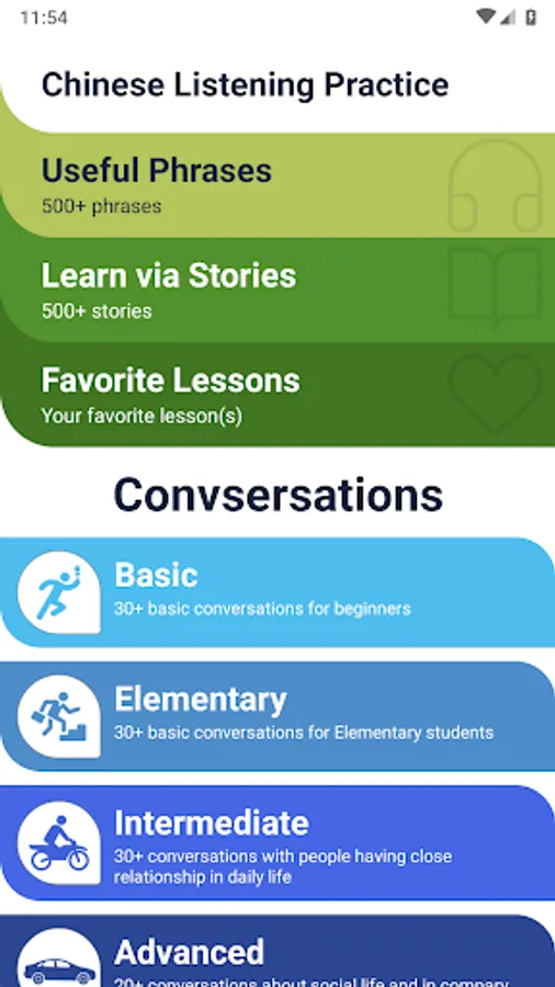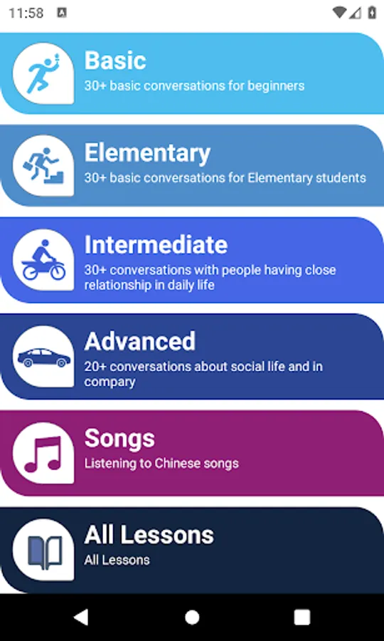 We provide lessons into levels and each lesson has pronunciation and meaning.