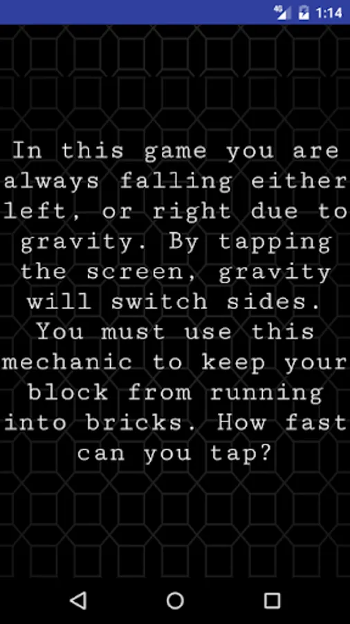 In this game you are always falling either left, or right due to gravity. By tapping the screen, gravity will switch sides. You must use this mechanic to keep your block from running into bricks. How fast can you tap?