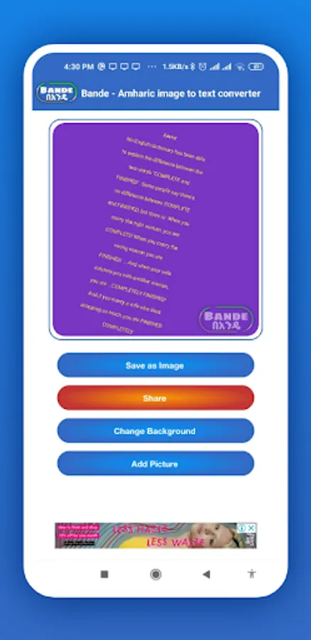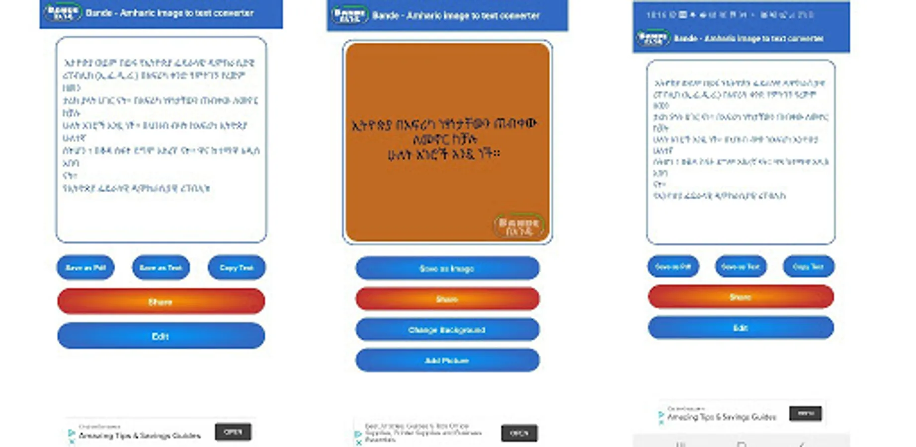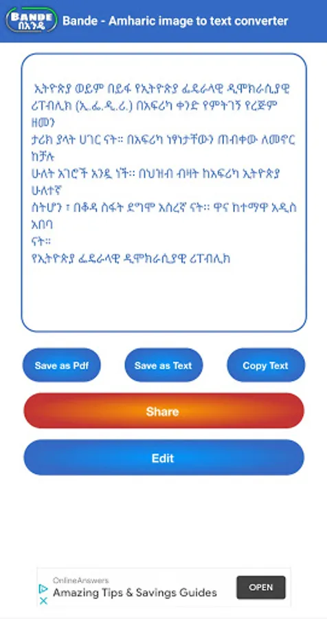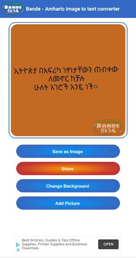 Bande means instantly in Amharic. Our app instantly scans and recognise any letters in Amharic or any language from an image.