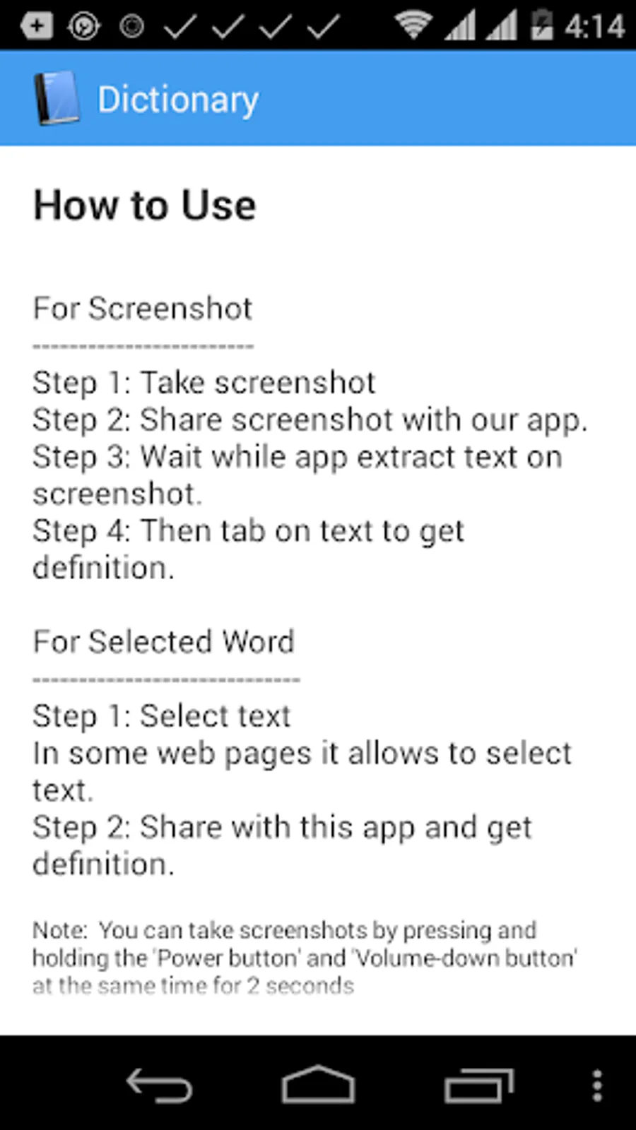 Step 1: After take picture using camera, you can share with this app to get definition of any words on that picture.