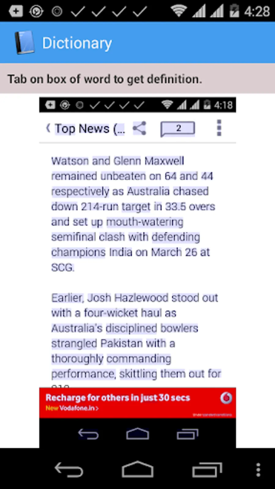 Here OCR Technology is used to extract text on mobile screenshot as to get definition of extracted words.