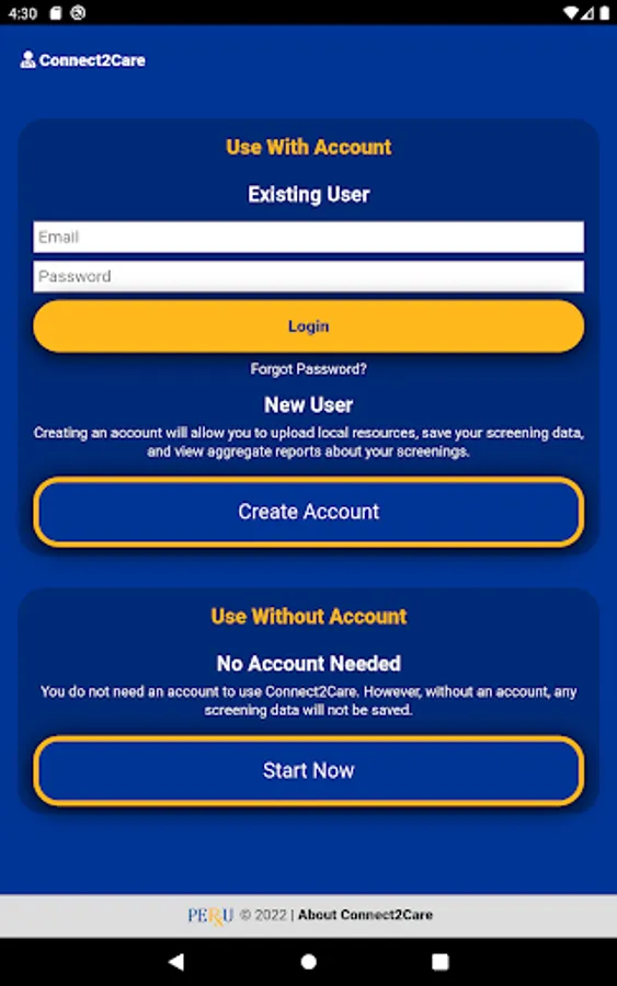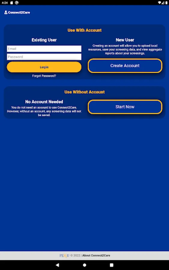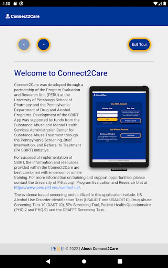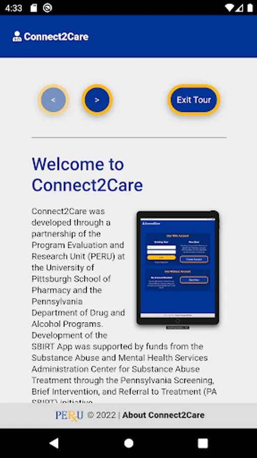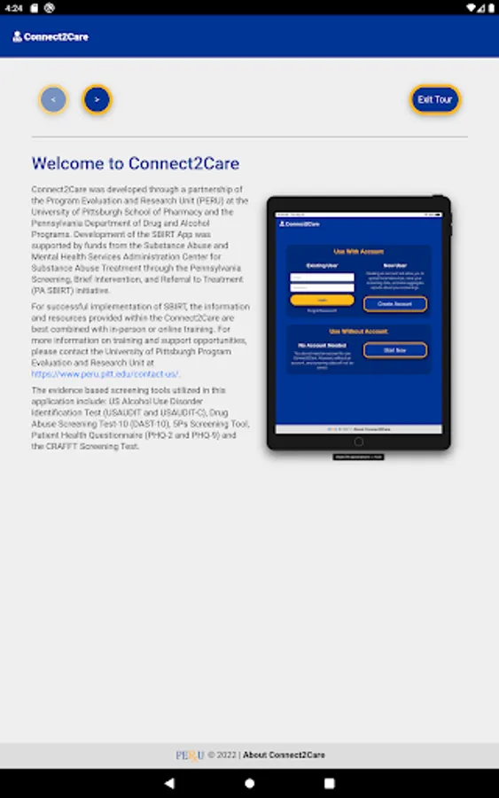 Connect2Care was developed through a partnership of the Program Evaluation and Research Unit (PERU) at the University of Pittsburgh School of Pharmacy and the Pennsylvania Department of Drug and Alcohol Programs. Development of the Connect2Care App was supported by funds from the Substance Abuse and Mental Health Services Administration Center for Substance Abuse Treatment through the Pennsylvania Screening, Brief Intervention, and Referral to Treatment (PA SBIRT) initiative.