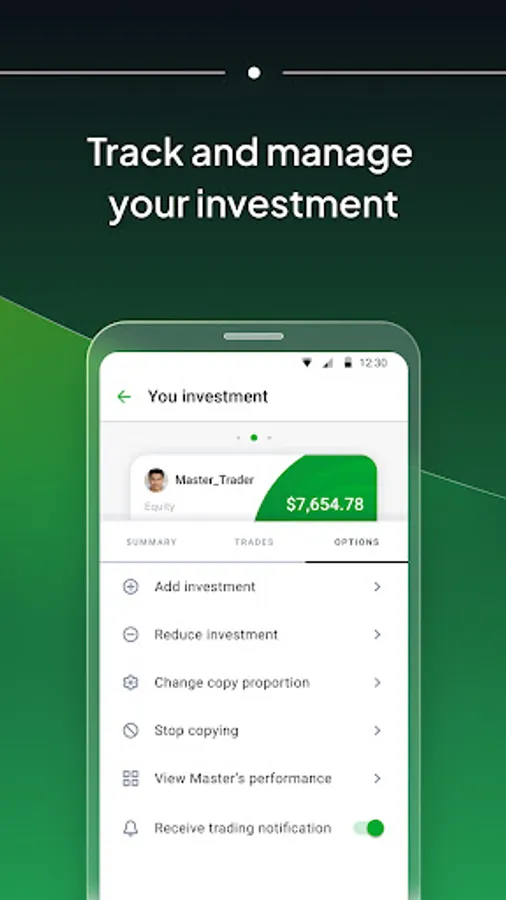 With the OctaFX Copytrading app, you stay in complete control of your finances. You can get detailed statistics on how your investments perform: your profit amounts, floating profit, equity, percentage of your gain, and the breakdown of your investment success with every Master Trader. You can also modify your settings or stop copying trades manually at any time.