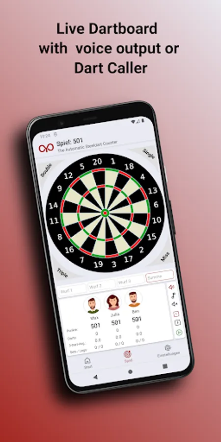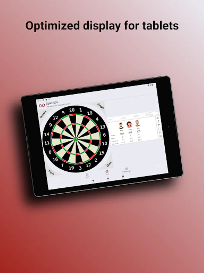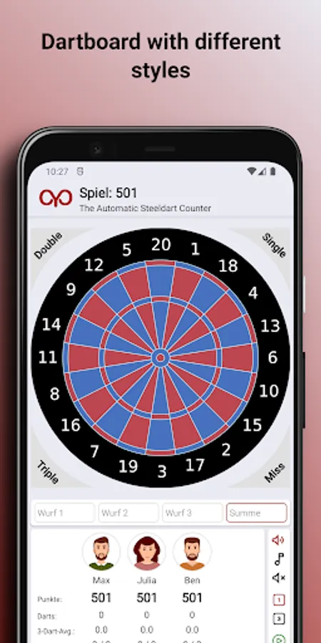 Record the hits on the live dartboard, in different styles. Simple entry of single, double and triple hits. Delete individual throws or register missed throws. An optimized view is available for tablets.