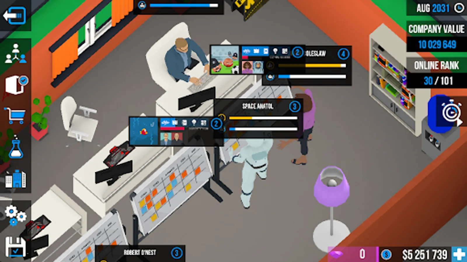 Train your employees, pay them bonuses, equip the office with dozens of useful items such as a billiard table and coffee machine.