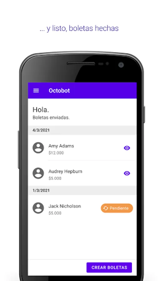 Hi, I'm Octobot. I am a robot made to generate your ballots in an easy and modern way. If you are a professional who generates tickets daily and it takes you time to go one for one of your clients, I can help you. Add your clients, select to send and that's it. Enjoy free time, leave tedious work behind.