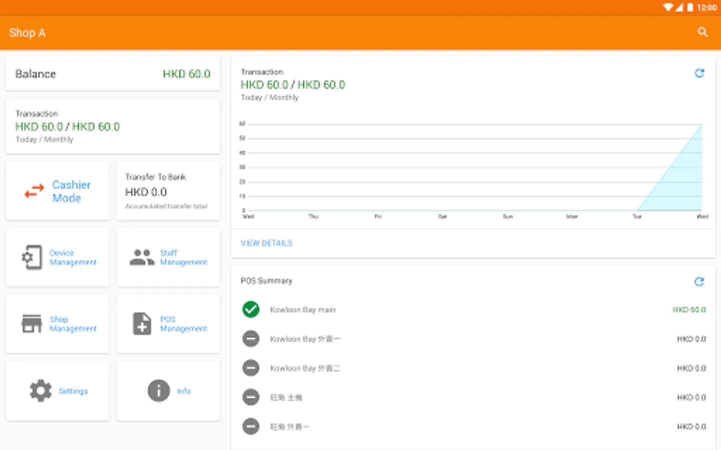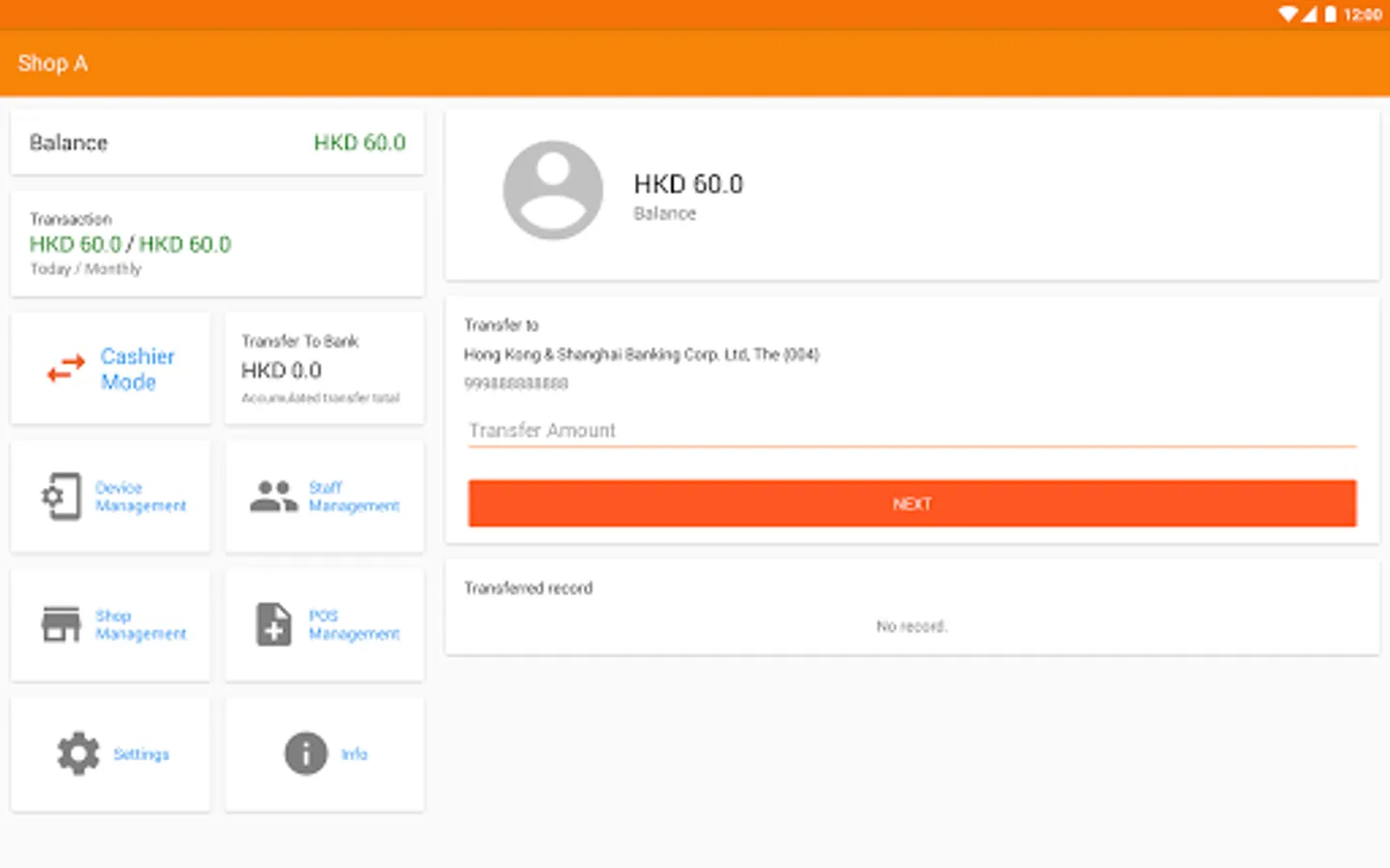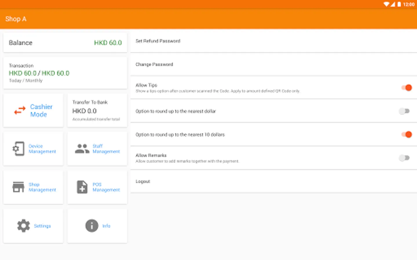 - Shop Owner Mode supports additional features regarding management of the Business Account, including add and remove cashier, POS and shop management, transfer balance to bank account, etc.