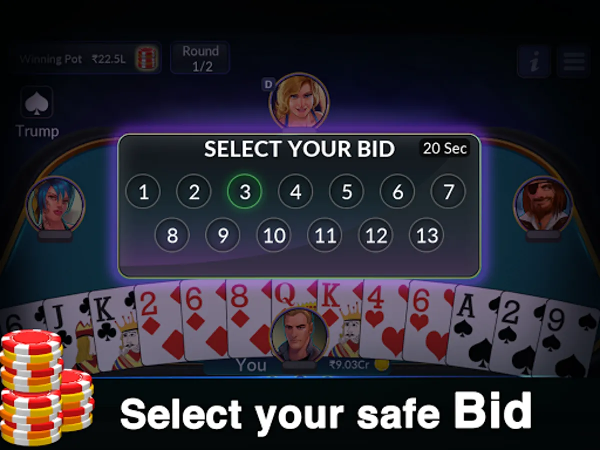 There are five round or five deal of play in every game on every public table (Public table: A table where any one can join and you will be sited randomly with any 3 players available globally). On the first deal dealer will be chosen randomly and after that the turn for dealing will be rotate clockwise. After distribution of all 52 cards between 4 players, all the players required to bid or call the number of hands or tricks they can make in the same round.