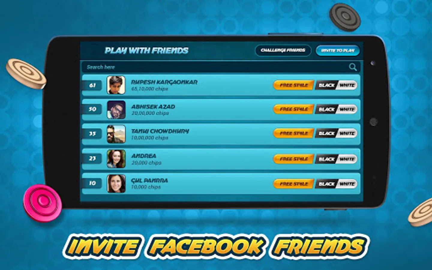 - Play with Friends – Invite, Challenge & Compete with your friends, Win the carrom challenges/matches and climb the leader-board.