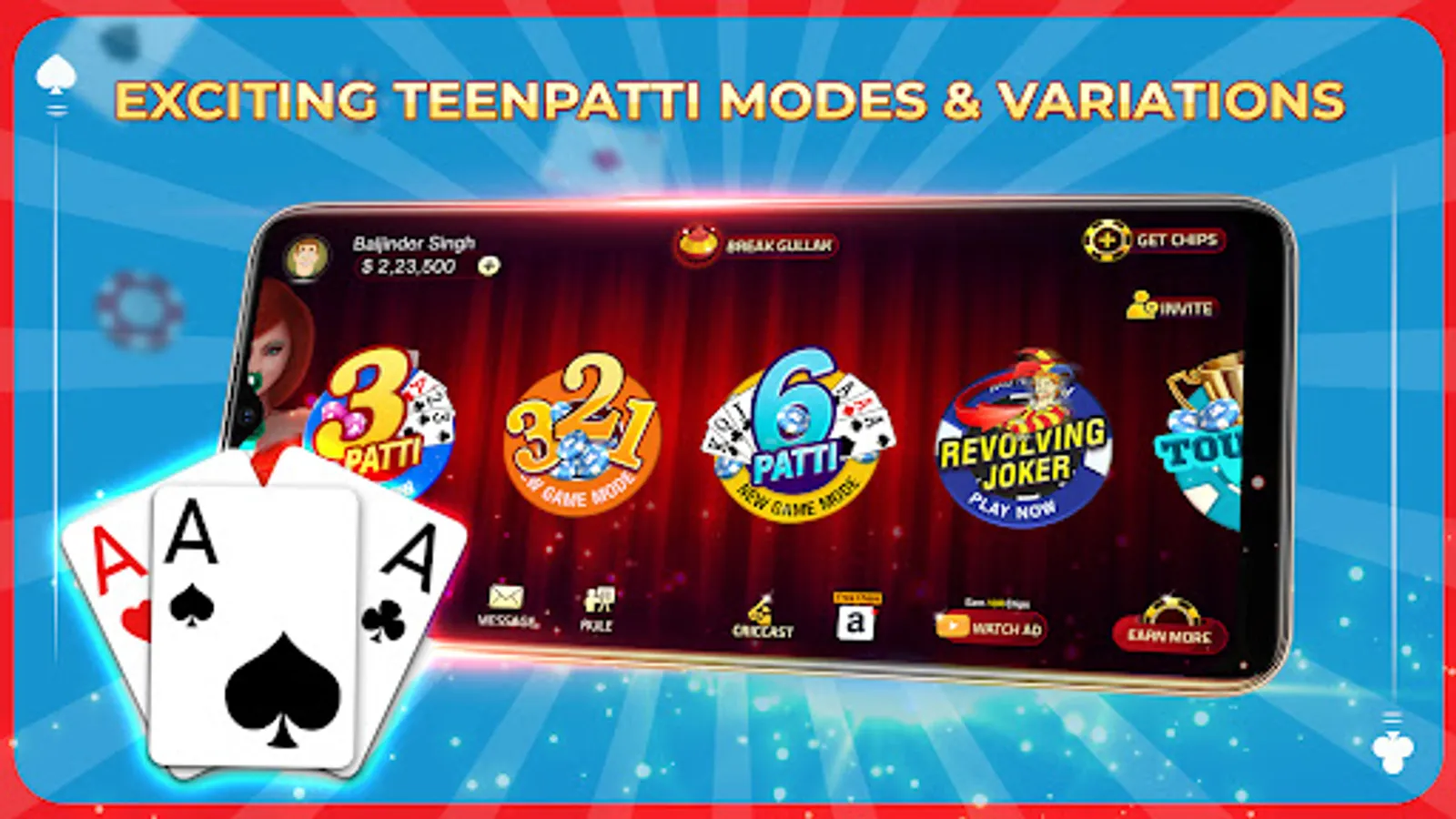 Play multiple tinpatti variations. Muflis, Revolving Joker, Lowest Joker, Joker, AK47, 999, 4X Boot, Banco, Hukam, In-Out & also enjoy TeenPatty Cricket!