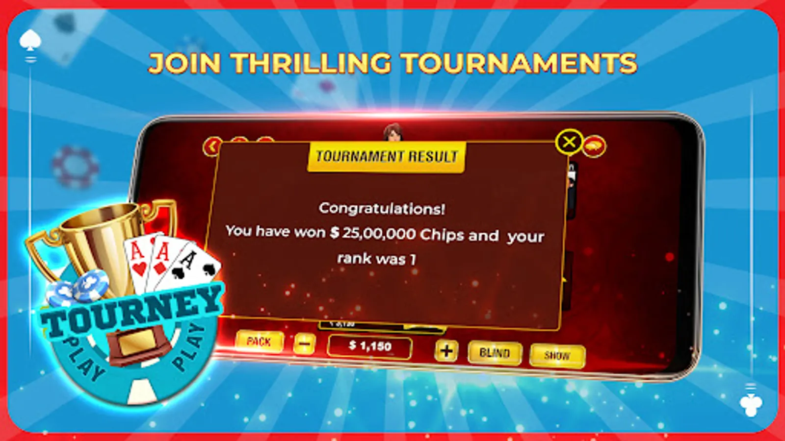 ♣ TOURNAMENT : Play Sit 'n' Go or take part in a high stakes 3 Patti tournament.
