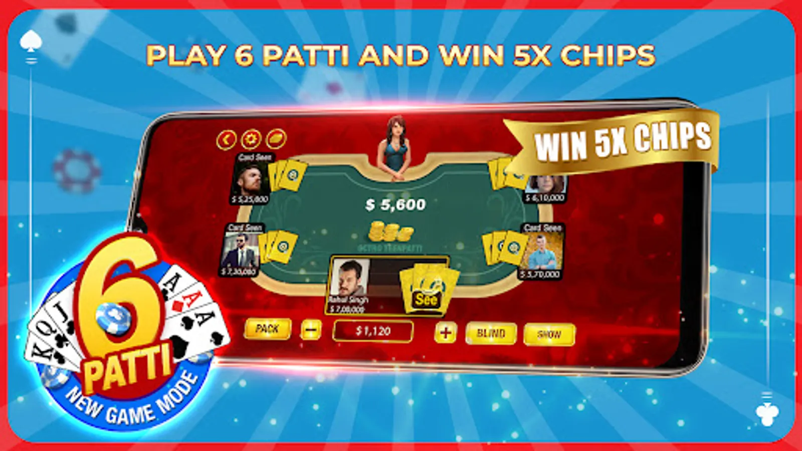 ♣ 6 PATTI : 6 Patti is a tinpatti tournament mode where 15 hands are played between 5 players. Online Teen Patti Winnings are 5 times the stakes.