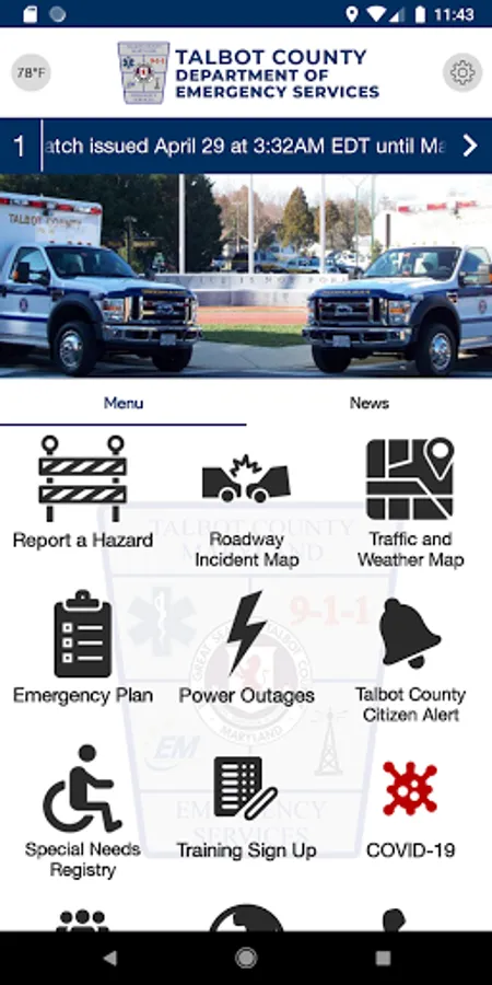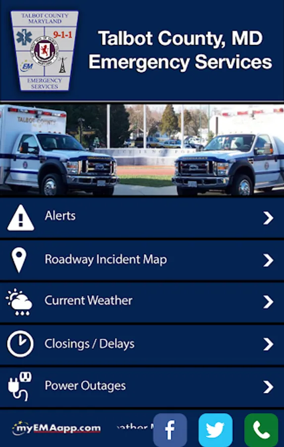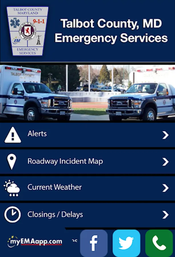 The Talbot County, Maryland, Emergency Services mobile application is an interactive app designed to improve communication, preparedness and resiliency for our citizens. Some of the items featured in this app include emergency alerts, local weather events, social media, contacts, and preparedness guidance. The Talbot County MD Emergency Services app can aid in preparation in the event of an emergency. This app is not meant to be used to report emergency situations. If you experience an emergency please dial 911.