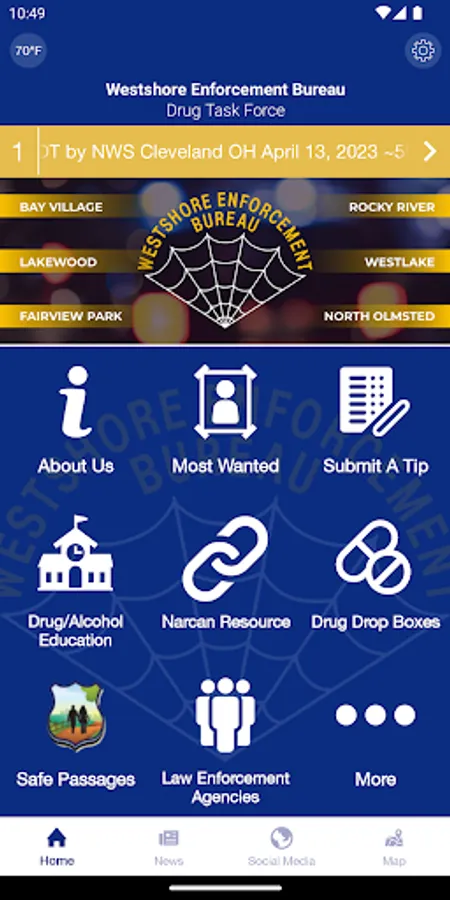 The Westshore Enforcement Bureau Drug Task Force (OH) mobile application is an interactive app developed to help improve communication with the residents of Bay Village, Fairview Park, Lakewood, North Olmsted, Rocky River and Westlake. The Westshore Enforcement Bureau Drug Task Force App allows residents to connect with the Bureau by submitting tips, utilizing drug and alcohol resources, provides substance abuse prevention strategies, substance abuse treatment referrals, and other interactive features, as well as providing the community with the latest news and information about the Drug Task Force.