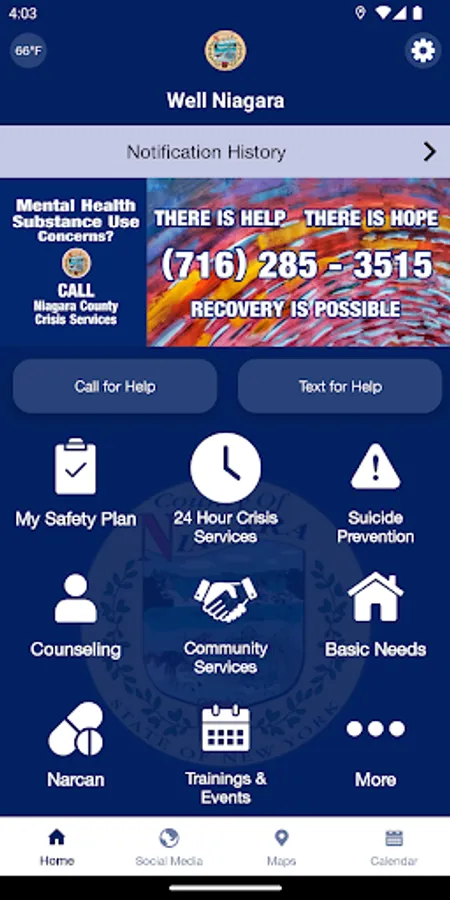The Well Niagara app is created for Niagara County, NY residents to increase awareness of and to connect / stay connected to a variety of resources that can assist with improving and sustaining mental, emotional, behavioral and physical wellness. For those struggling with mental health and /or substance use related concerns, calling Niagara County Crisis Services 24-Hour Phone line at 716-285-3515 or 9-8-8, or texting Got5 to 741741, can help with obtaining immediate assistance and support on a 24/7 basis. Individuals and their loved ones can better understand the signs of risk behaviors and warning signs and find important resources that will help them to make informed decisions. Create your own safety plan with actionable steps for harm reduction. Suicide awareness and prevention and locating an array of local supports, services and treatment options, are a main focus of the app as well as finding peace and calm in the midst of stressful and anxiety-provoking situations. Information on Narcan and training on its use in emergency situations along with other harm-reduction options and resources are included. In case of an emergency, call 9-1-1.