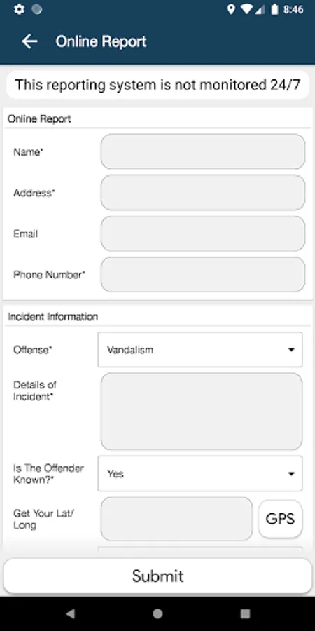This app is not intended to be used to report emergency situations. Please call 911 in an emergency.