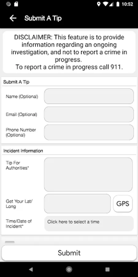 This app is not intended to be used to report emergency situations. Please call 911 in an emergency.