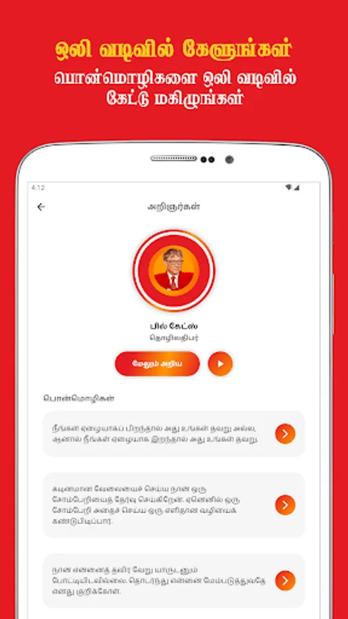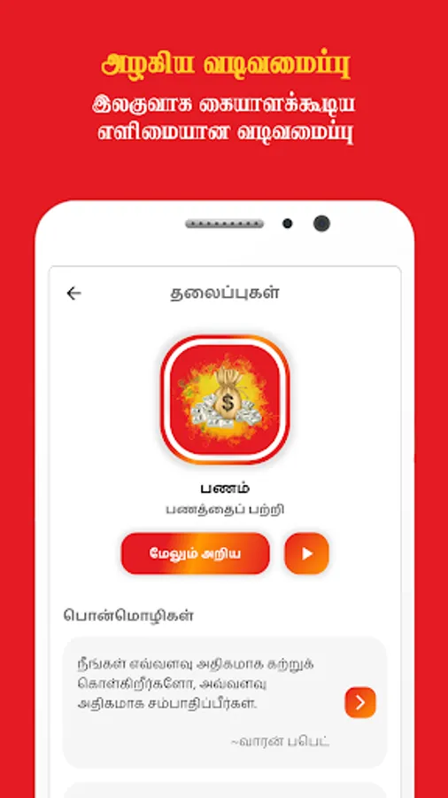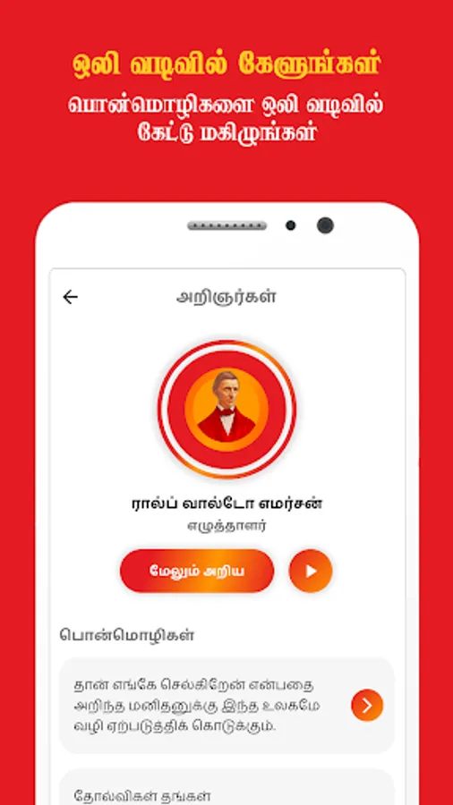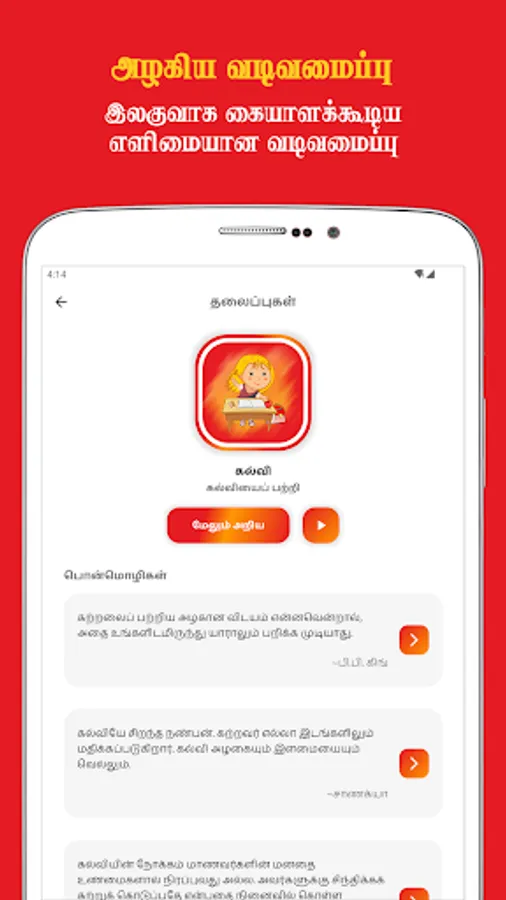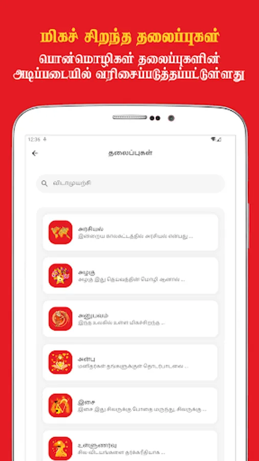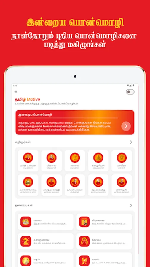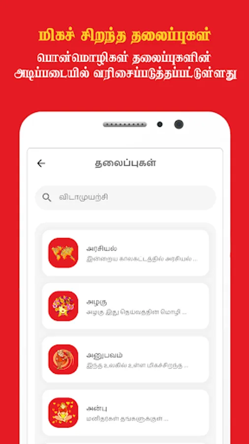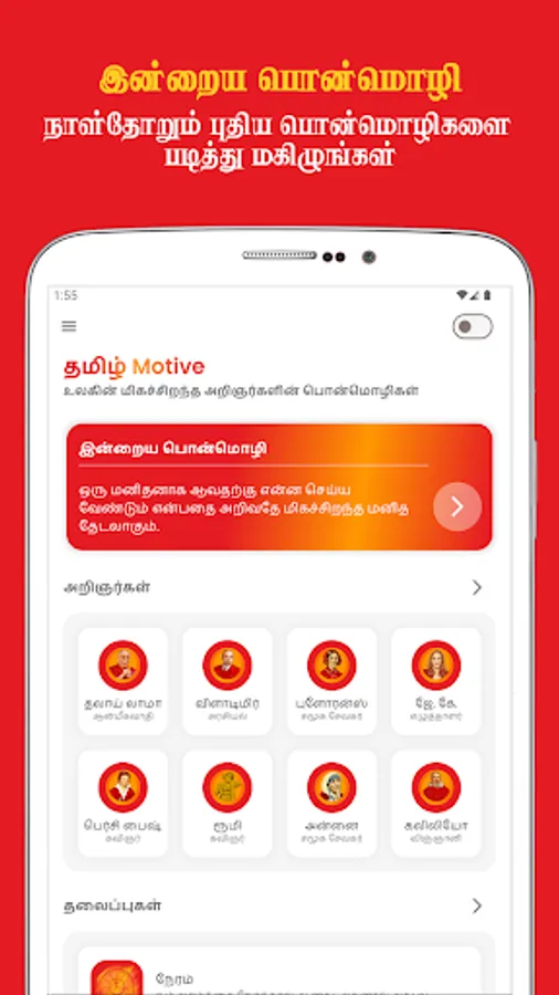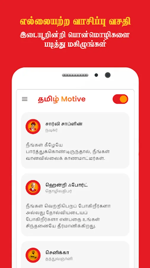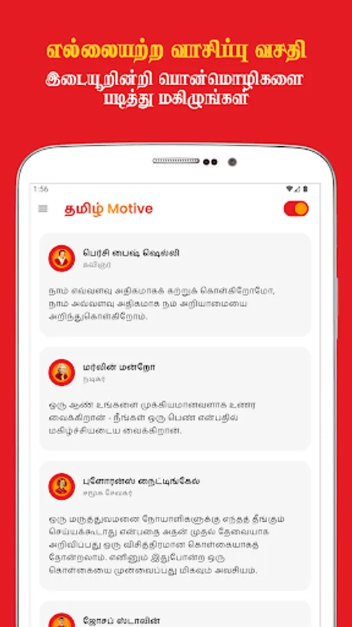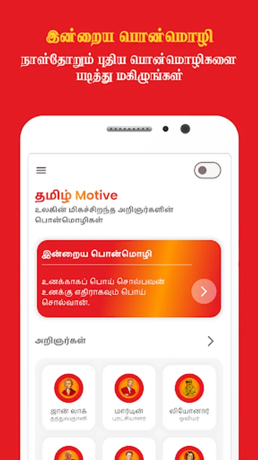 Tamil Motive is a world best Quotes app in Tamil Language. in this app you can read almost all great people quotes in tamil. and you can search quotes by authors name or topics heading.