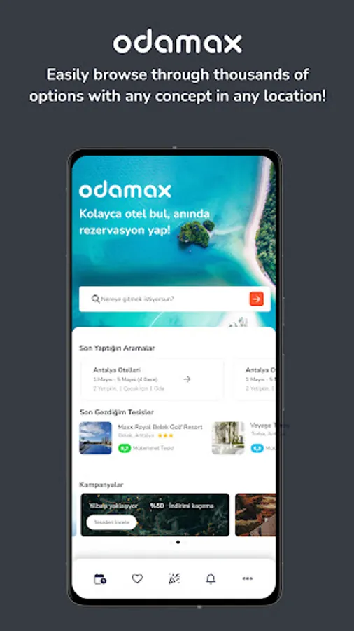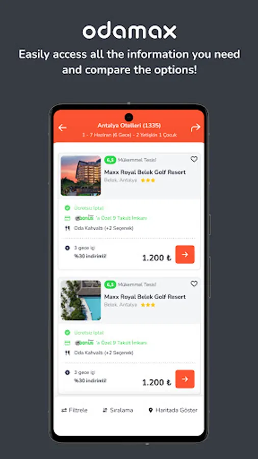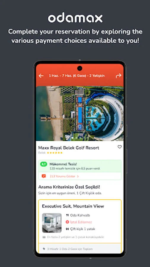 Advantage of paying at the property with the free booking opportunity… Thanks to the mobile application of Odamax.com, you can book your property instantly and make your payment at the property when your accommodation starts.