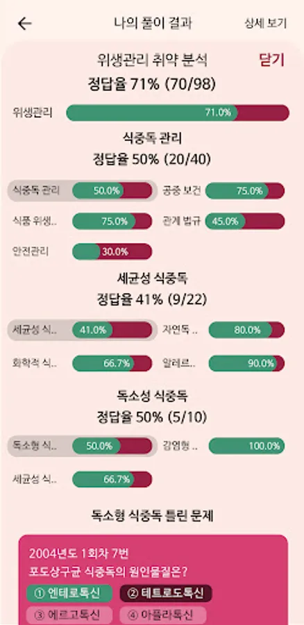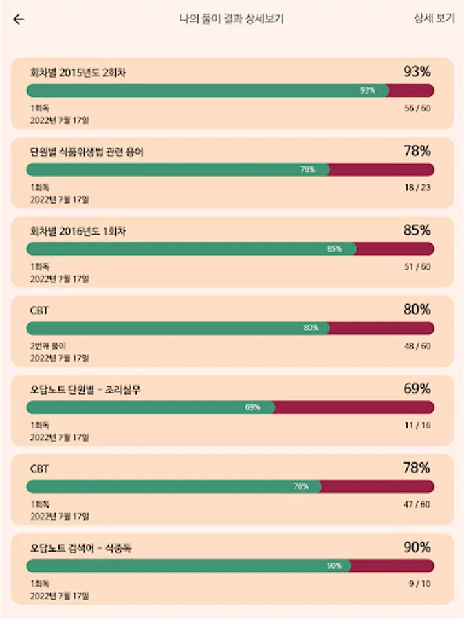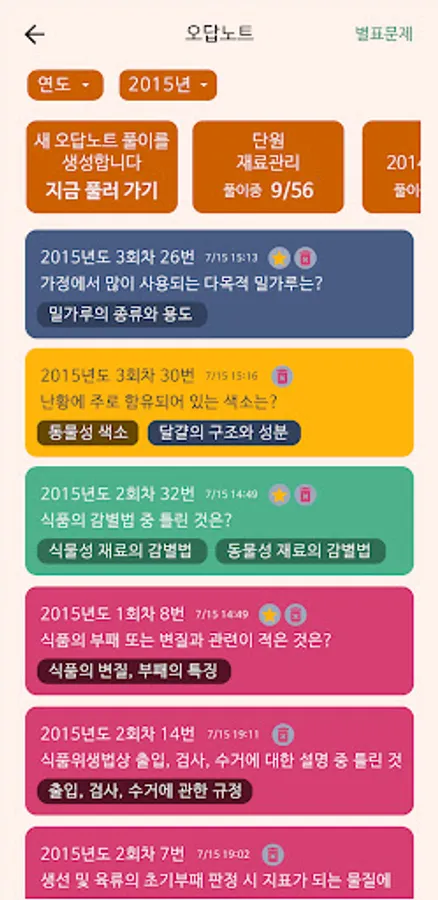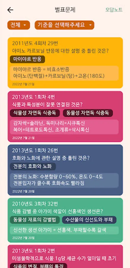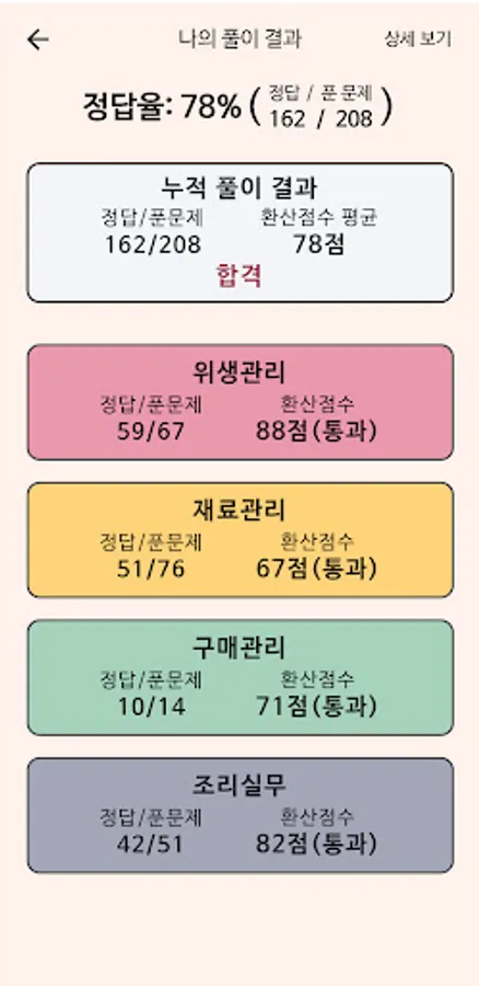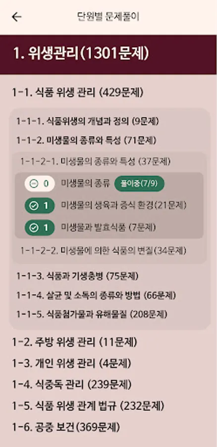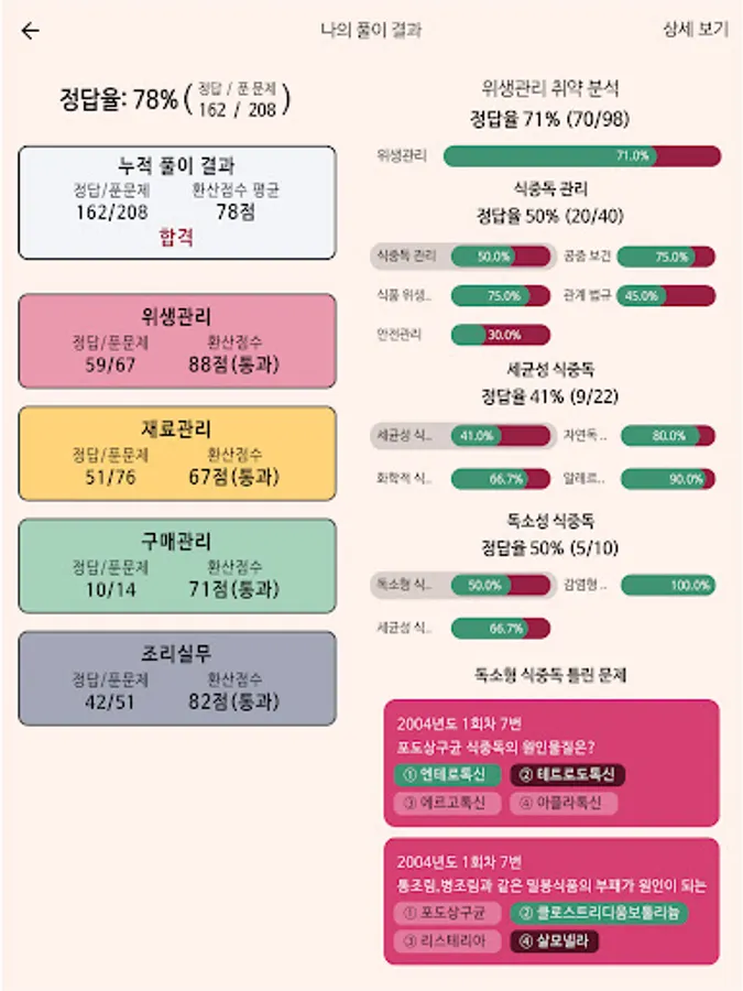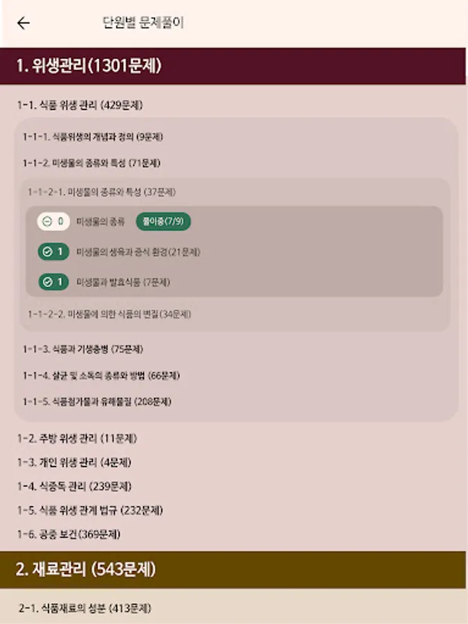 2. Subject-specific problems and summary notes All problems were categorized by subject (sanitation management, material management, purchasing management, cooking practice) and by topic. In addition, we have prepared for efficient learning and memorization through summary notes that collect and organize key memorization points for each topic.