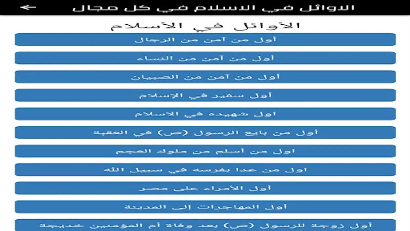 The application contains information about the Rightly Guided Caliphs and the Ten Promised Heaven, and a religious competition