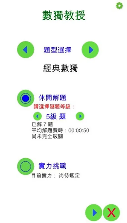 在本模式下,您可以自由的選擇謎題的層級進行解題,如果在解題的過程中遇到解不出下一解的狀況,還能要求程式進行解題教學。所以本模式為消閒練腦、厚植數獨實力的最佳場所。