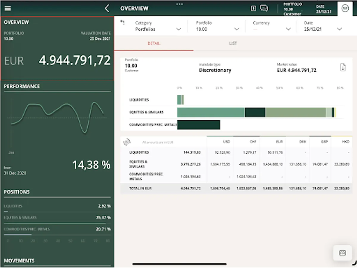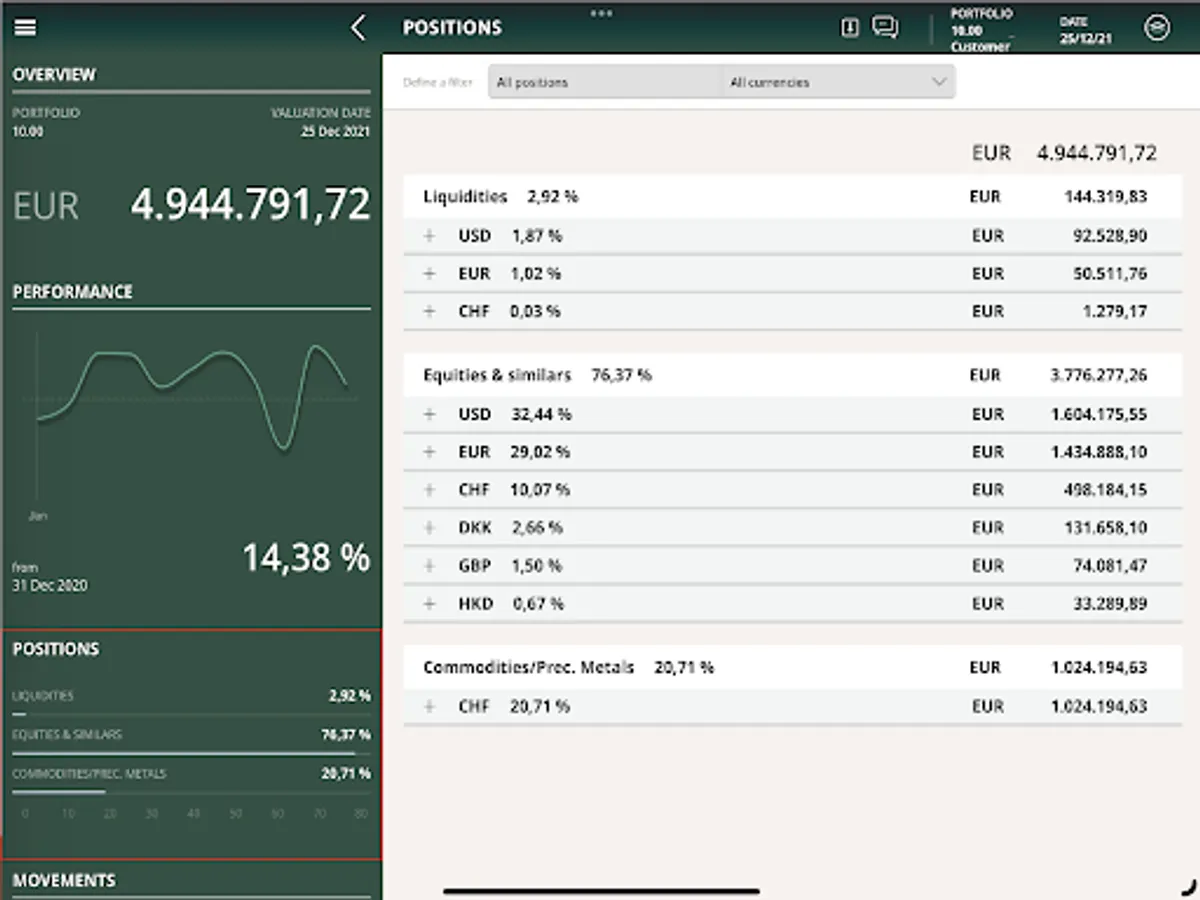 - Get a more detailed overview of your wealth (asset allocation, position details, performance, and movements)