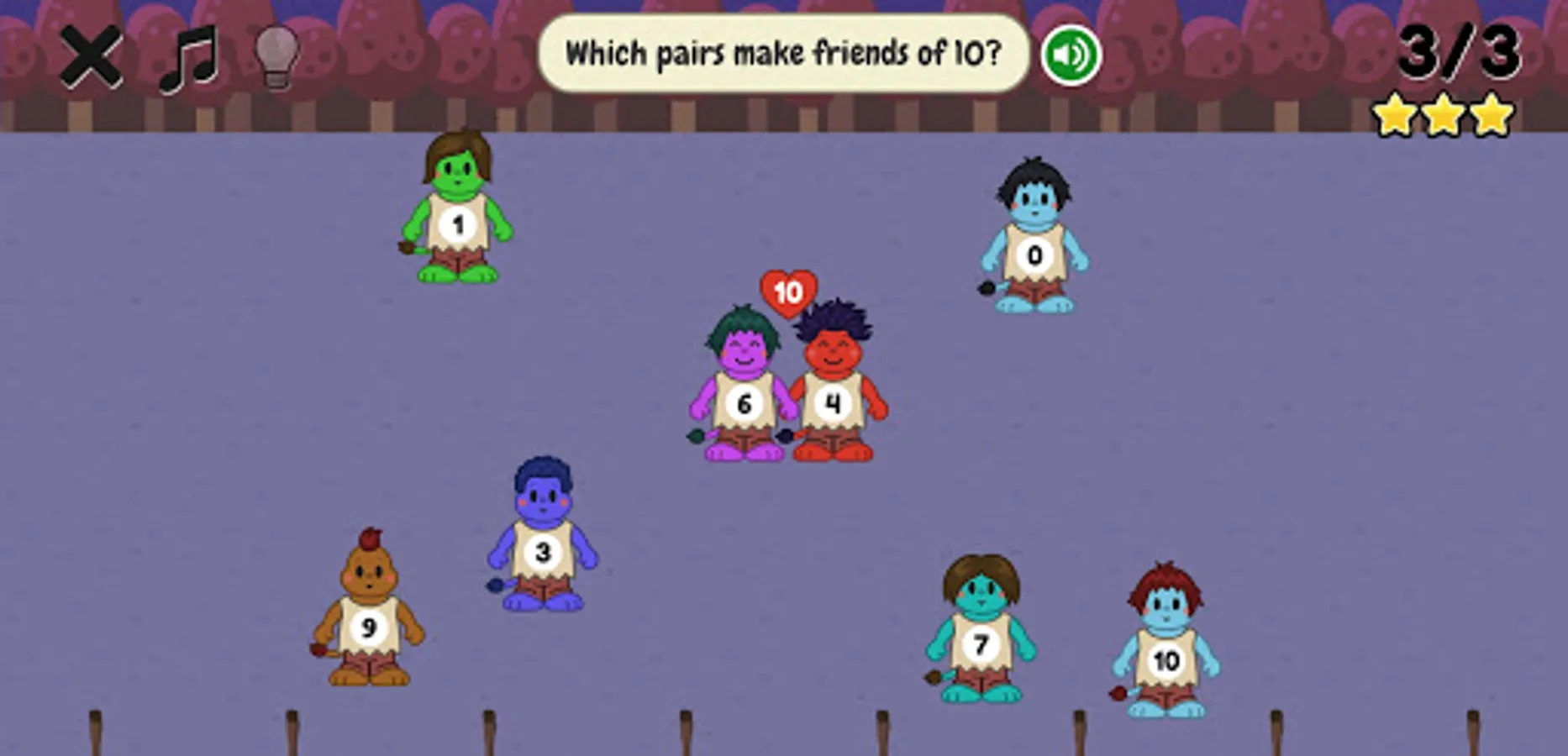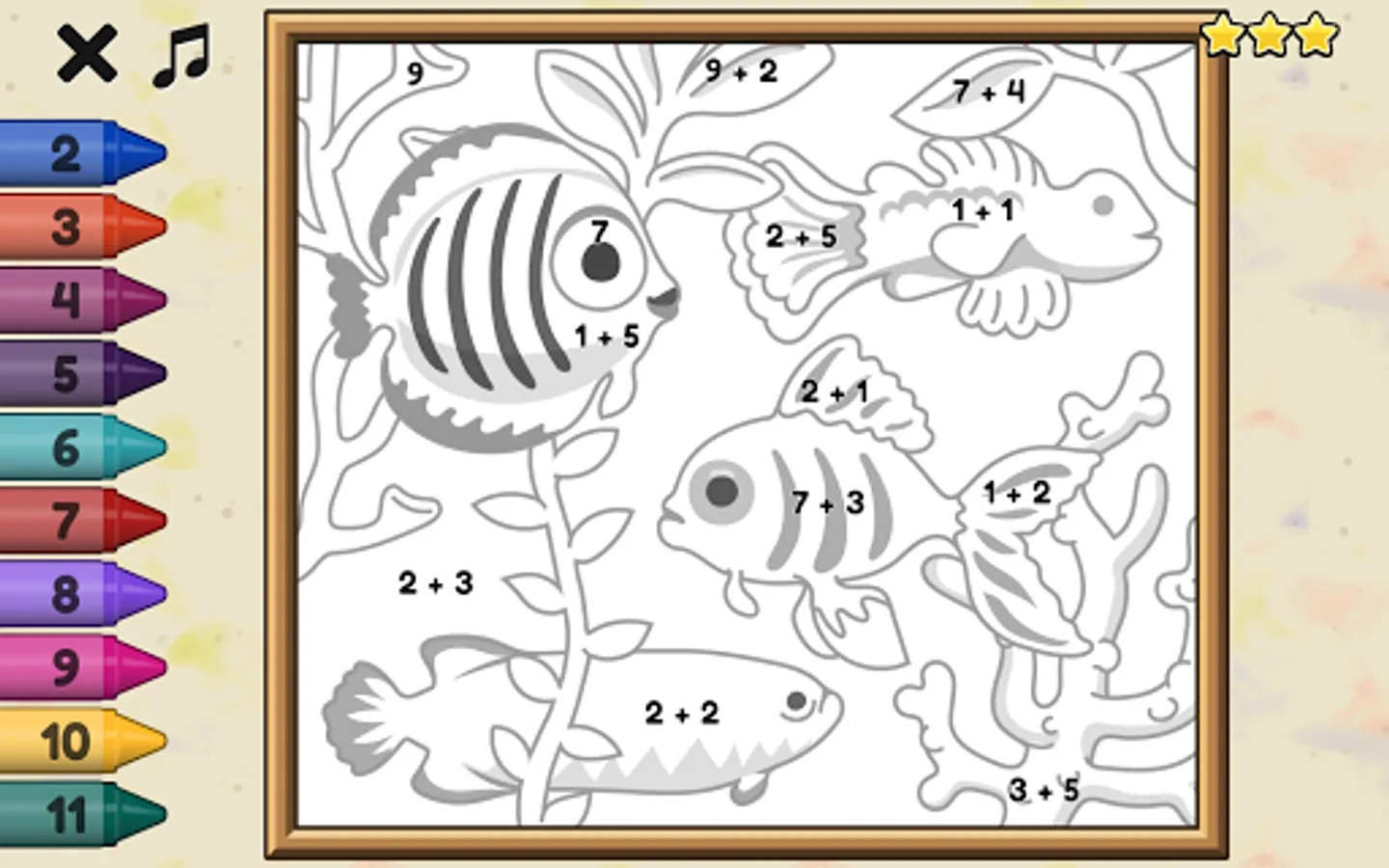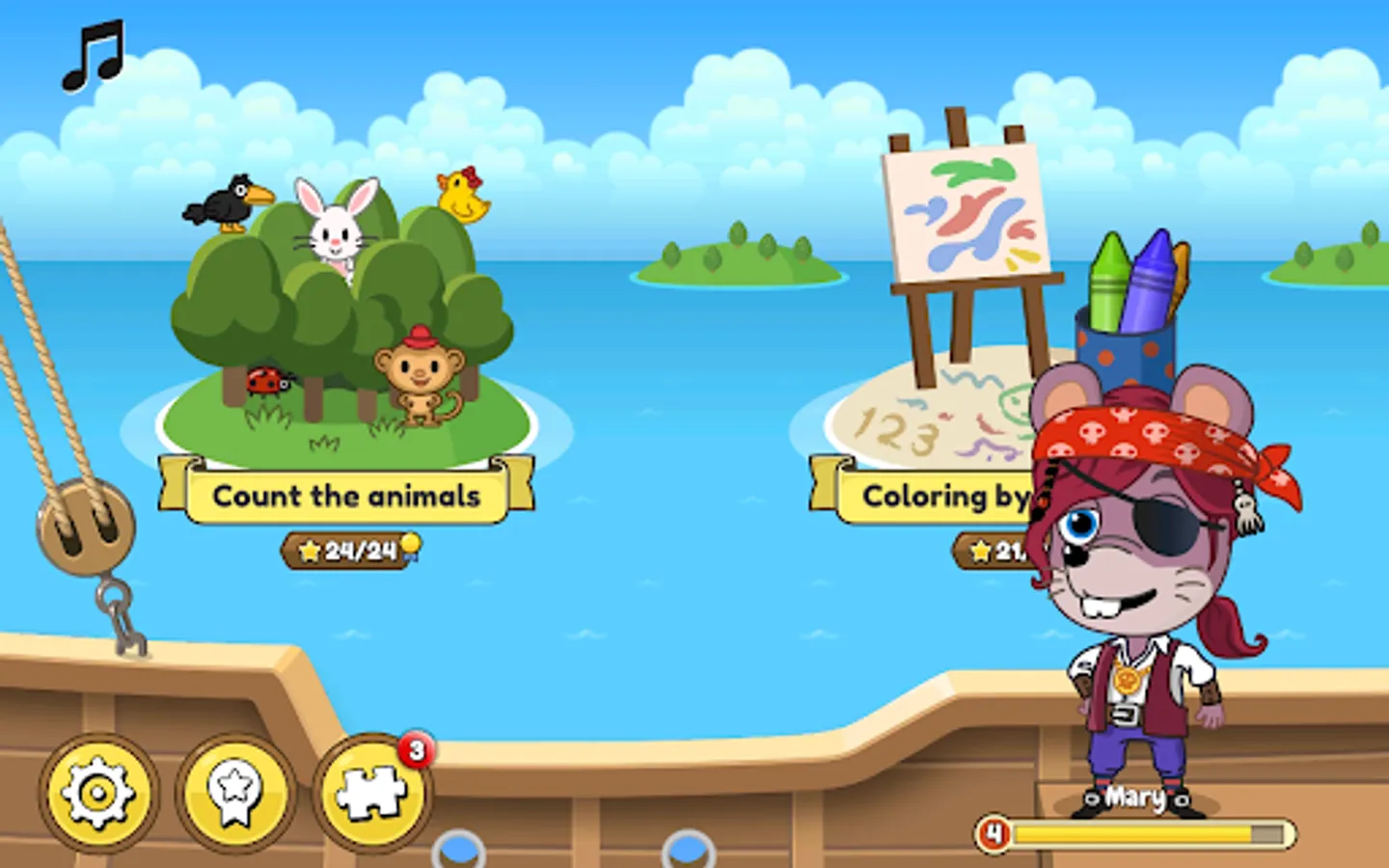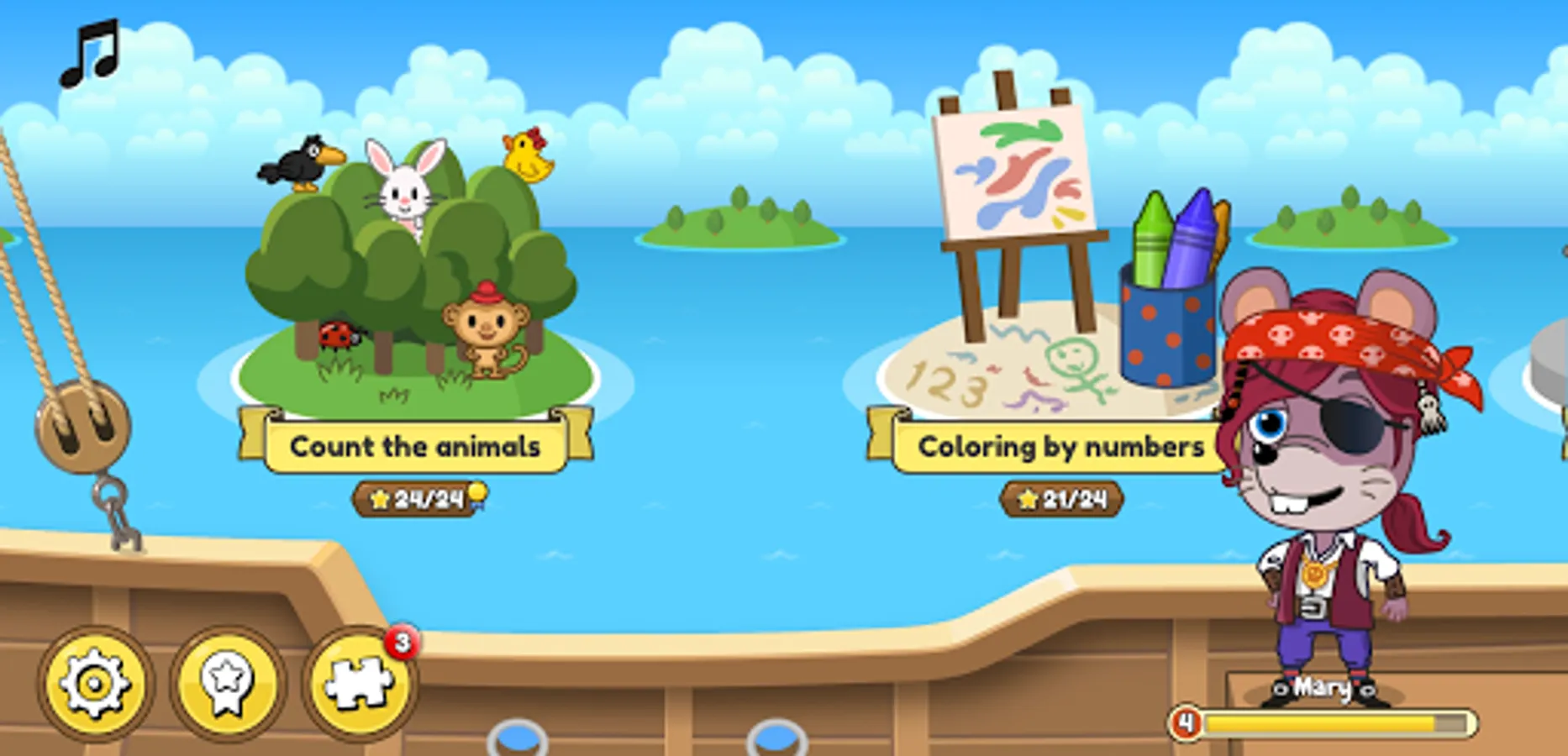This educational math game contains activities and puzzles for grades K-3. The player chooses a character and travels from island to island to meet challenges such as counting animals in the woods, matching up number friends, drawing dot-to-dot, coloring by numbers, completing patterns and playing a memory matching game. Get stars and level up the character by completing the stages of the game. There are also medals and pieces of a jigsaw puzzle to collect as additional rewards and encouragement for the child.