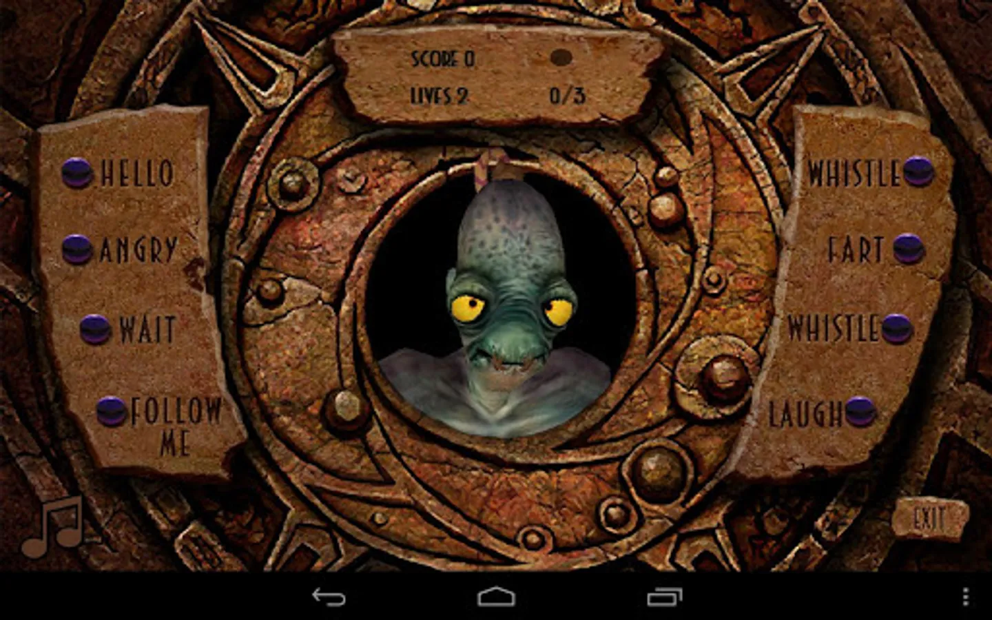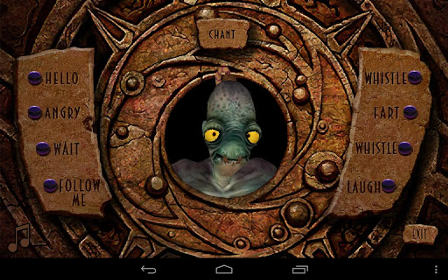 Abe speaks. Recreate the GameSpeak you remember from Oddworld: Abe's Oddysee. Fart, chant, whistle and growl as well as give Abe's famous commands. Speak into the microphone and hear Abe repeat it back to you in his voice!