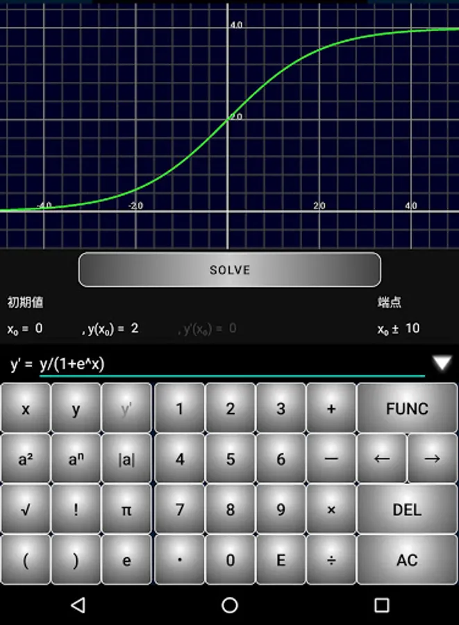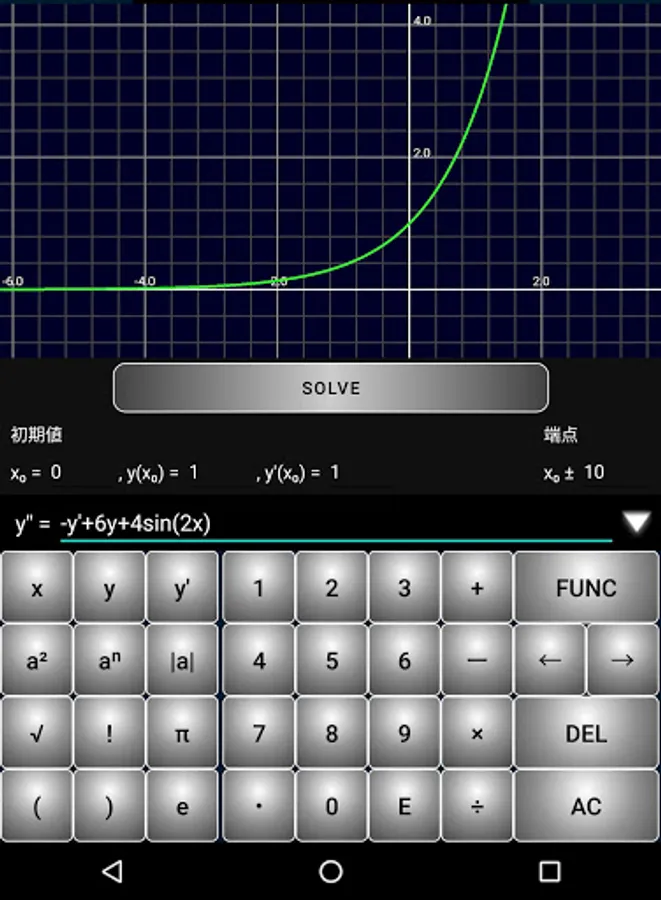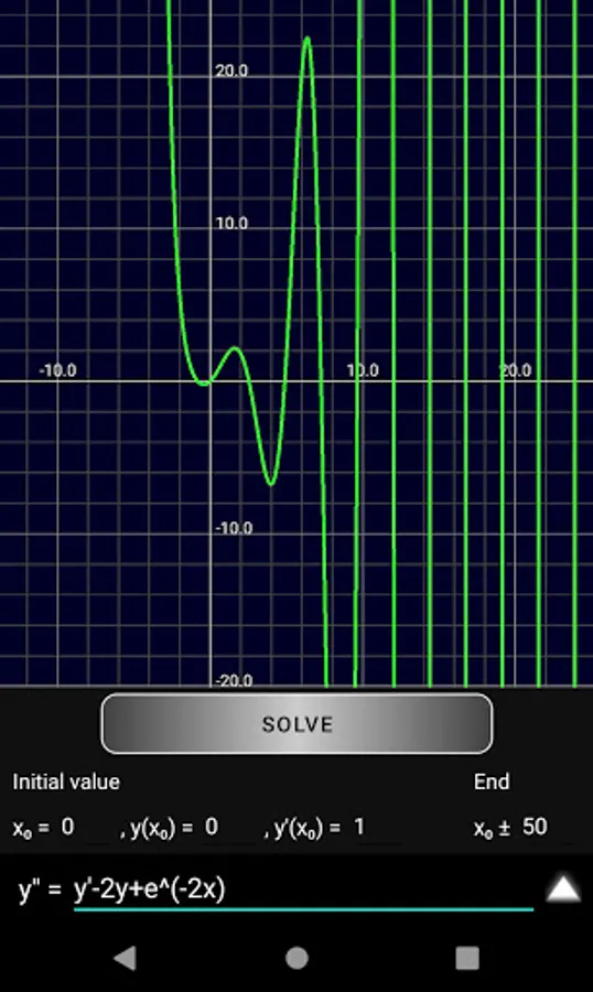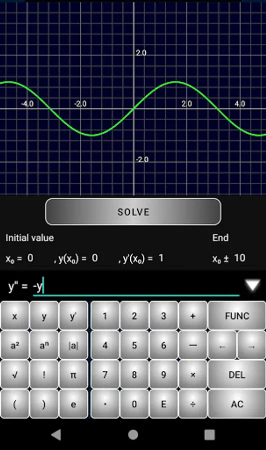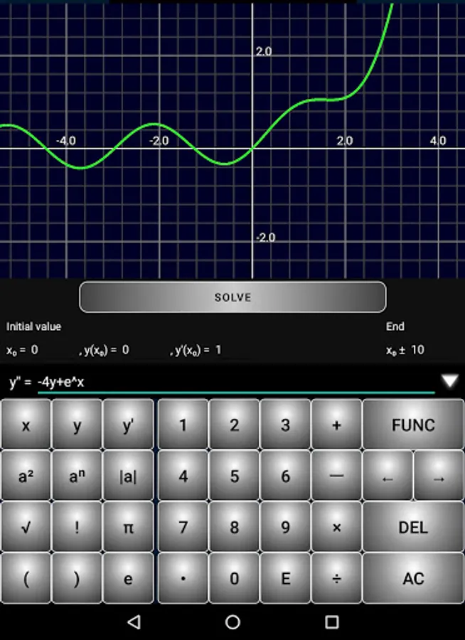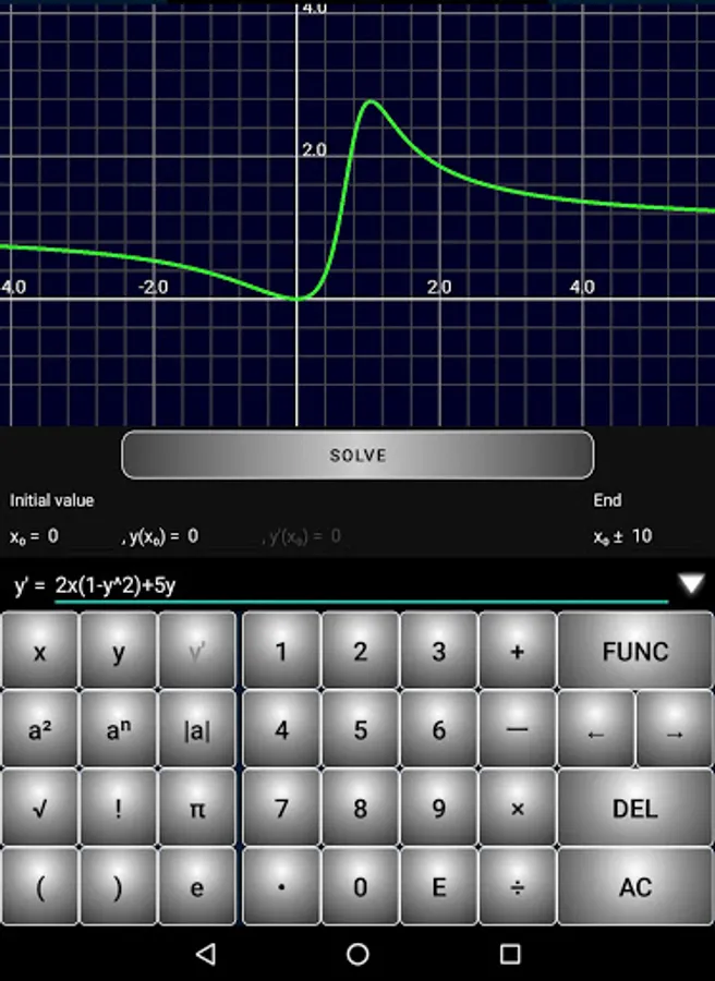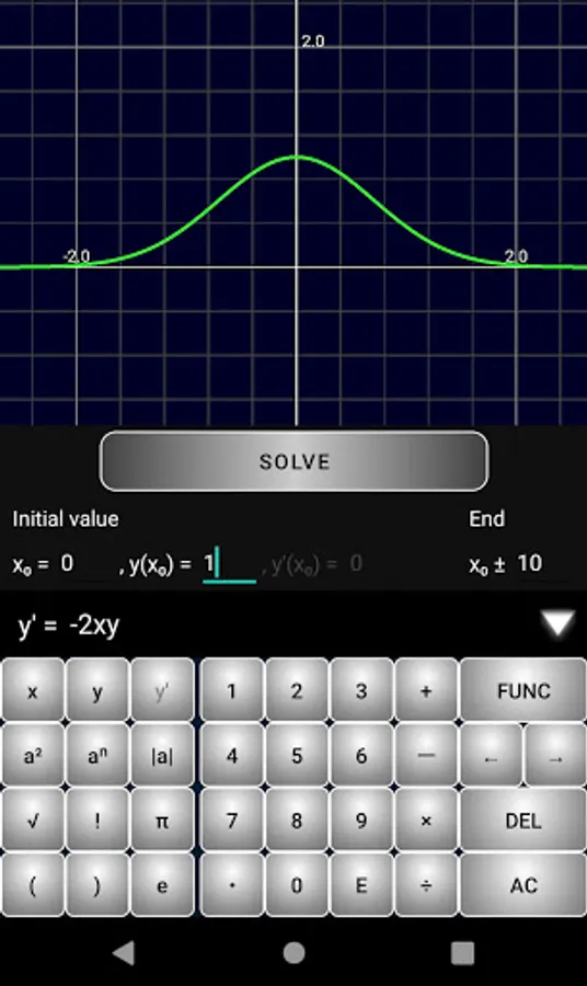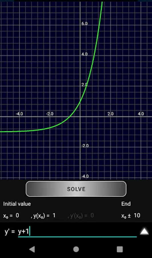 The app can solve 1st order and 2nd order differential equations numerically. If solution exists, an integral curve which meets the equation and initial conditions will be drawn on the graph.