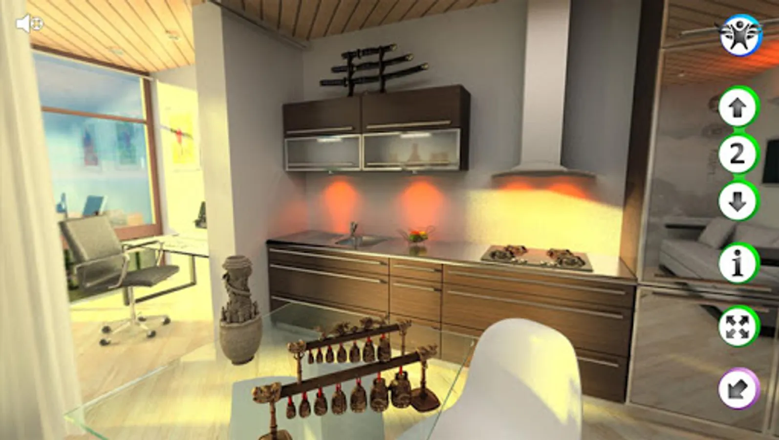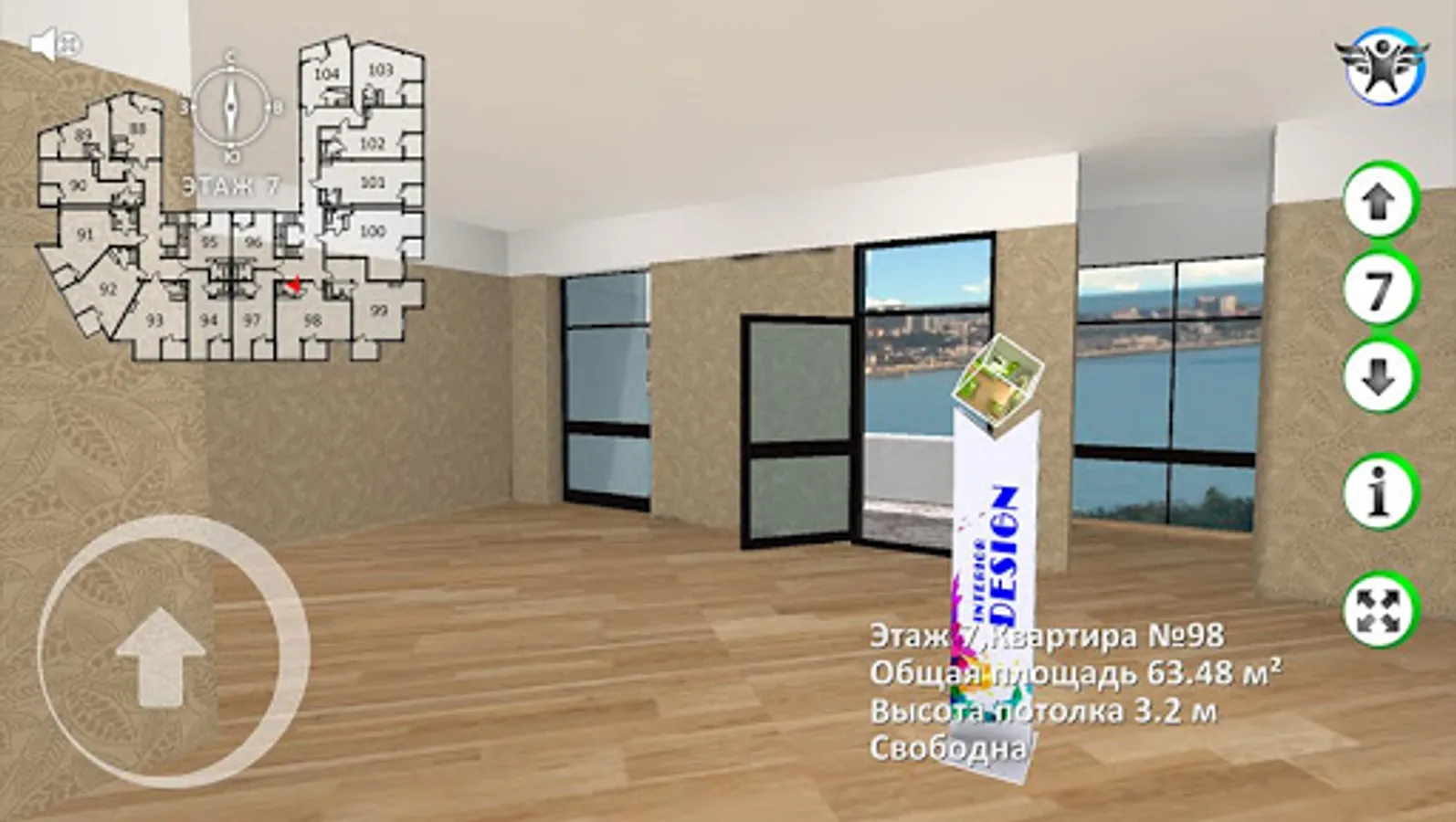 An open-plan apartment with the possibility of association of 32 sq.m. and a ceiling height of 3.2 meters. It offers panoramic views of the sea and mountains.