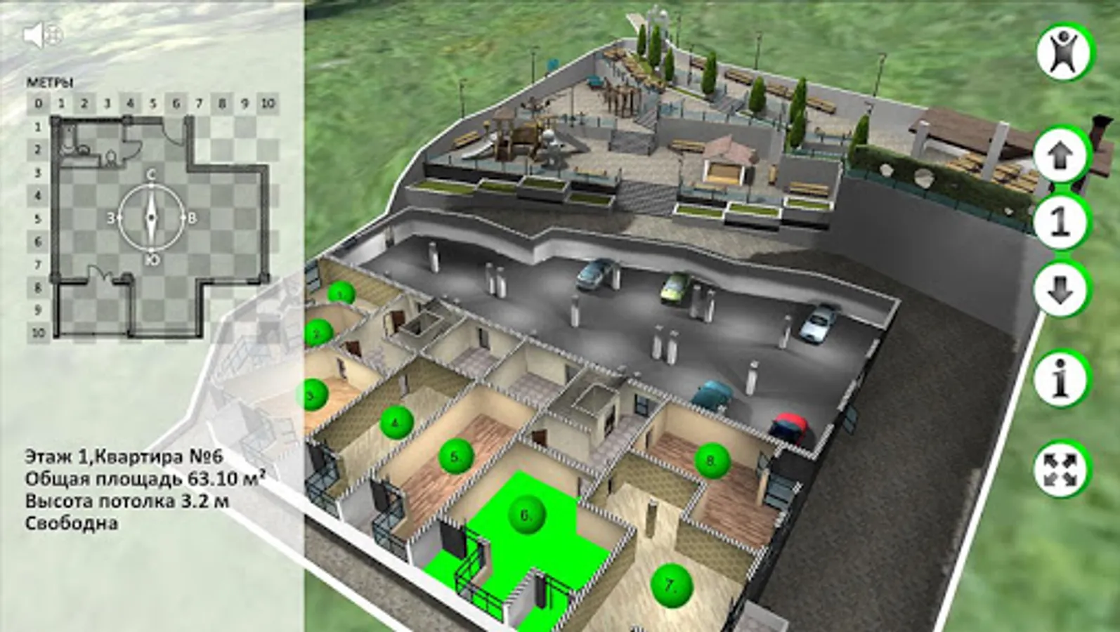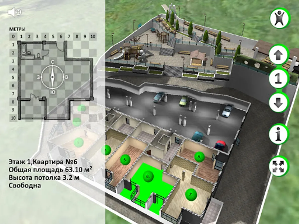 9.7 acres located eight storey building with two entrances. Underground parking for 48 cars with Elevating ostanovkami.Karkas house - concrete monolith, finished materials class luxury.