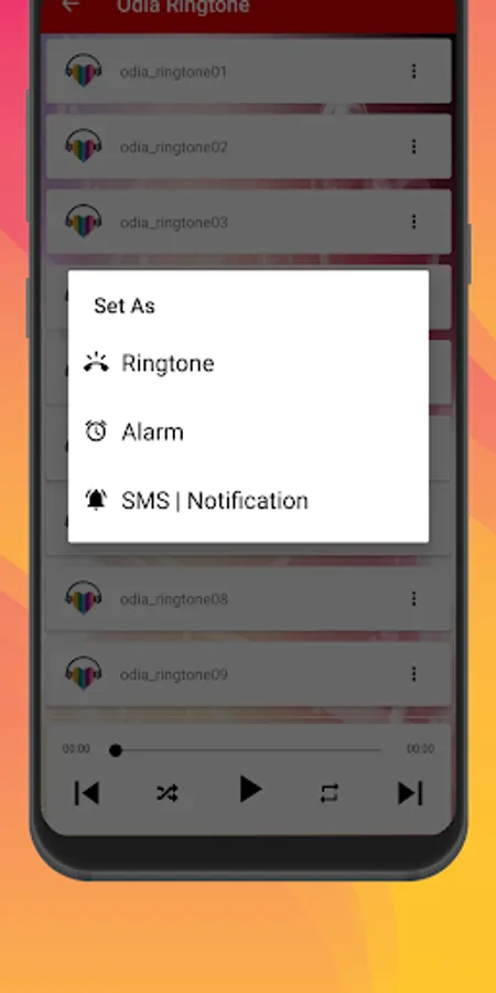 First, you can download this free Odia ringtone app, Then you can press the " play " button to listen to the ringtone, and to set it as ringtone click on three-dot(â‹®) and choose the ringtone you are done!