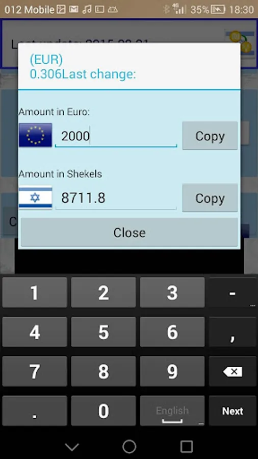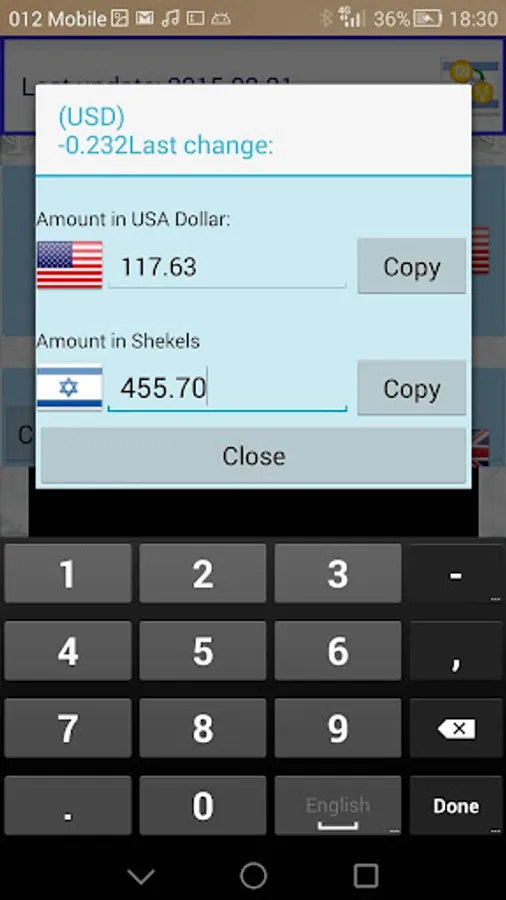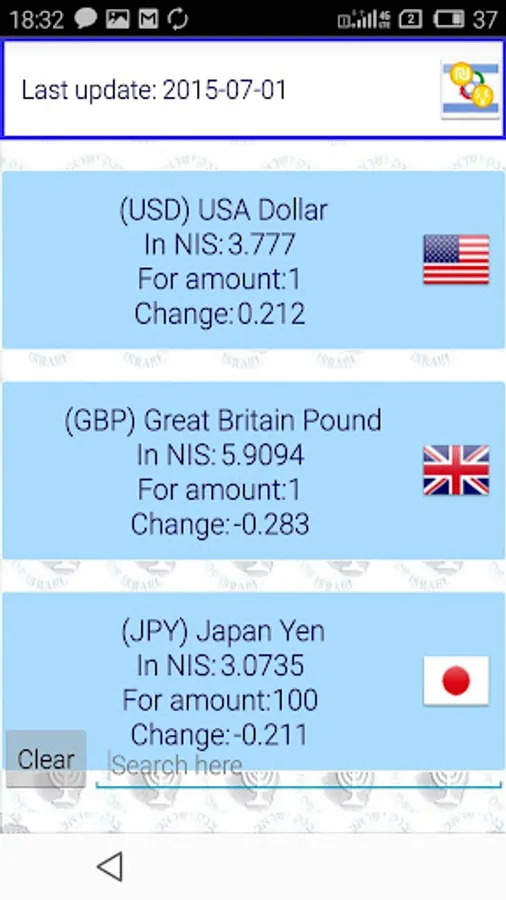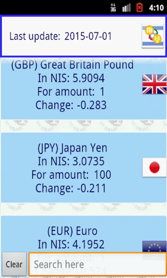 The application provides up-to-date exchange rates for Israeli new Shekel against next currencies: Dollar USA, Canadian dollar, British Pound, Japan Yen, Euro, Australian dollar, Denmark krone, Norway krone, South African Rand, Sweden krone, Switzerland frank, Jordan dinar, Lebanon pound, Egypt pound.