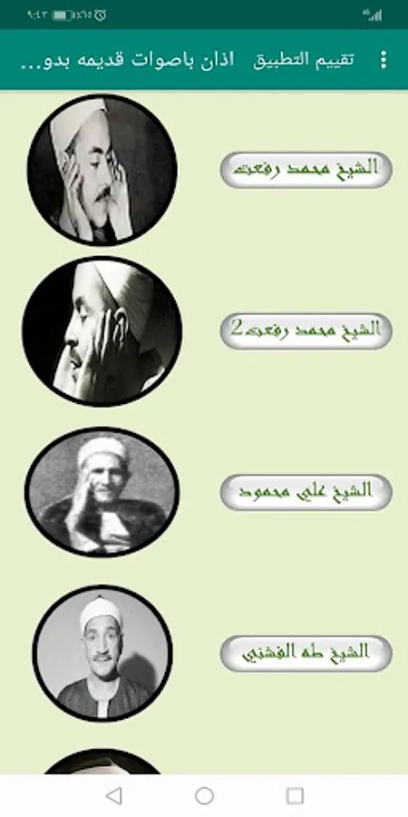 Old Azan Voices application is an application that contains the call to prayer by the voices of old sheikhs such as Sheikh Muhammad Refaat, Sheikh Ali Mahmoud, Sheikh Taha Al-Fashni, Sheikh Mustafa Ismail, Sheikh Al-Naqshbandi, Sheikh Abu Al-Aynin Sheisha, Sheikh Ali Ahmed Mulla, Sheikh Mahmoud Khalil Al-Hosari, Sheikh Mahmoud Ali Al-Banna and Sheikh Kamel Yusef Al-Bahtimi And Sheikh Mahmoud Abdel Hakam, Sheikh Muhammad Omran, Sheikh Nasr El Din Tobar and Sheikh Al Shaashai, and the application does not need the Internet to work