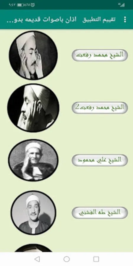 The application of Azan with old voices is an application that contains the call to prayer with the voices of the old sheikhs such as Sheikh Muhammad Refaat, Sheikh Ali Mahmoud, Sheikh Taha Al-Fashni, Sheikh Mustafa Ismail, Sheikh Al-Naqshabandi, Sheikh Abu Al-Ainin Shuaisha, Sheikh Ali Ahmed Mulla, Sheikh Mahmoud Khalil Al-Hosari, Sheikh Mahmoud Ali Al-Banna and Sheikh Kamel Youssef Al-Bahtimi And Sheikh Mahmoud Abdel Hakam, Sheikh Muhammad Imran, Sheikh Nasr Al-Din Tobar and Sheikh Al-Shashai, and the application does not need the Internet in order to work