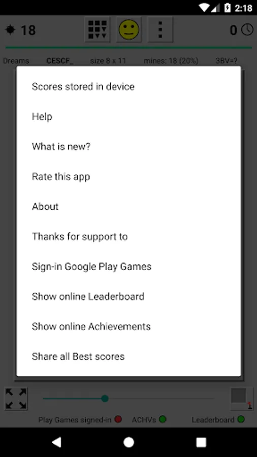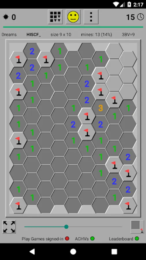 The app will first analyze the information available to the player at the moment. It shows circles on the tiles, which must be logically empty (green) or hiding the mine (red). If it is not possible to specify any safe (green) tile based on information known to the player, the game marks uncertain tiles by blue circles. You can turn the color circles off and on again by clicking on the mine’s icon or the indicated number of remaining unmarked mines at the top left.