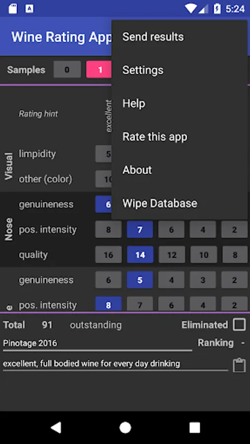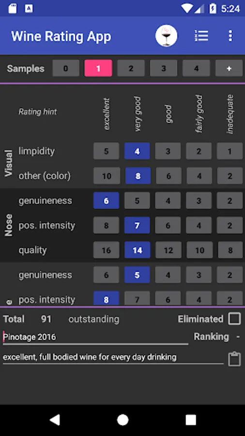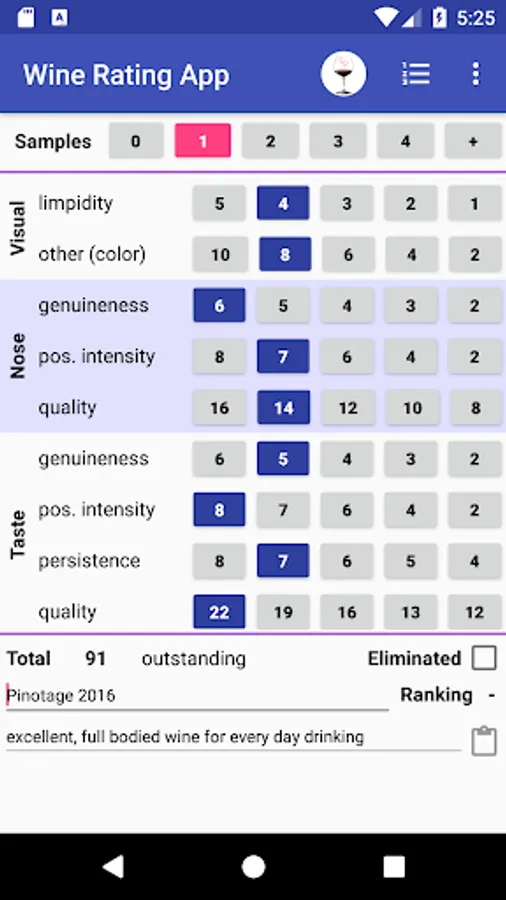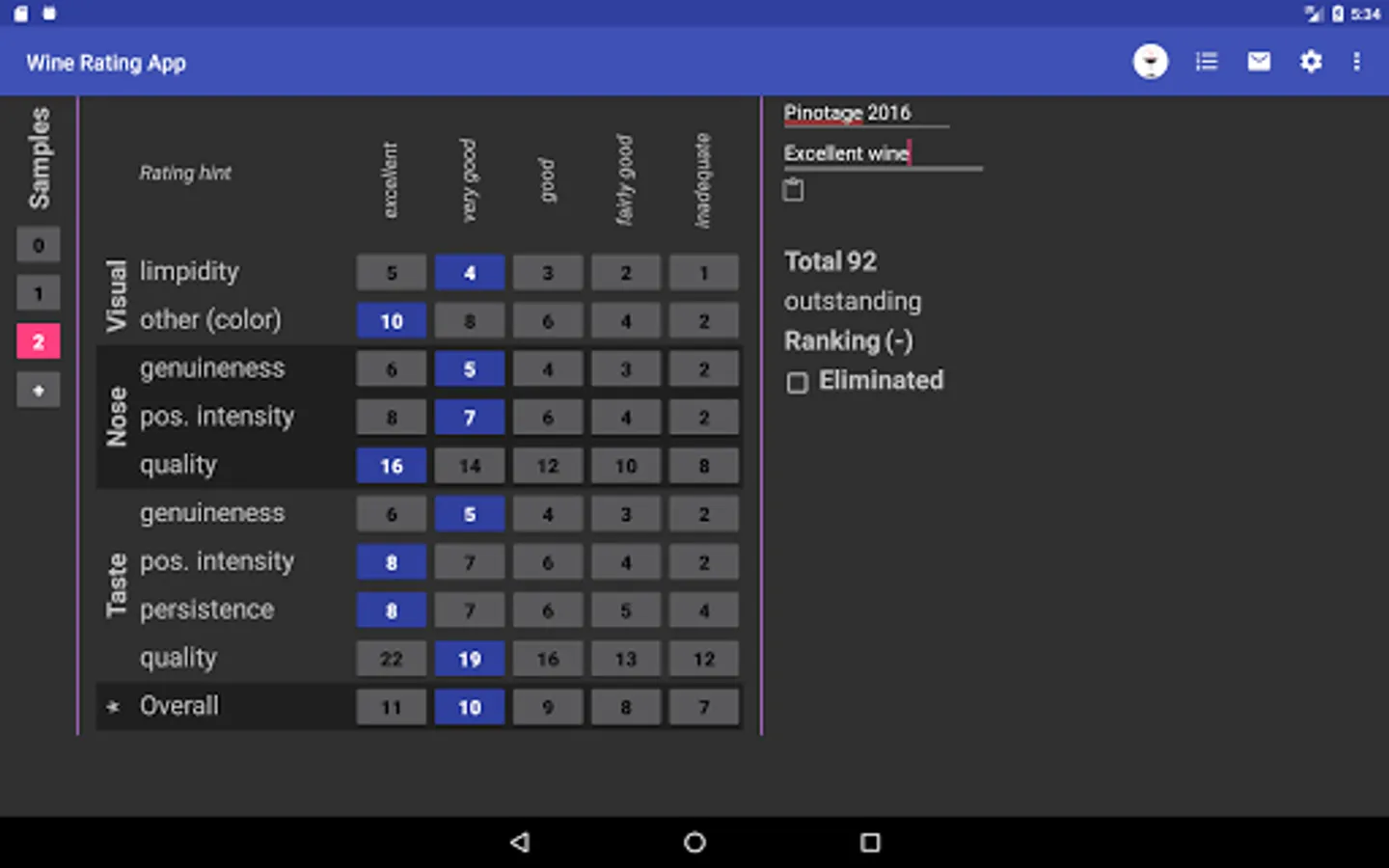 This wine rating app is suitable for wine enthusiasts. Focus on wine tasting and let the app help you with calculating the score. It uses international 100 points system for wine rating. Such ratings are used on wine competitions.