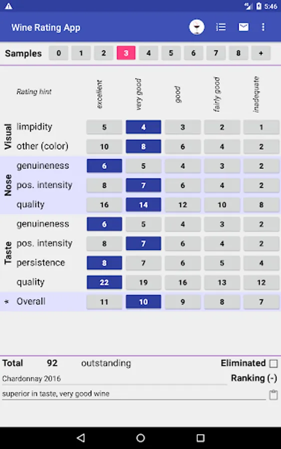If you like to know more about professional approach using 100 points system search for OIV ECO 332A/2009.